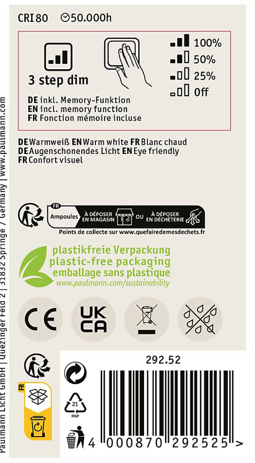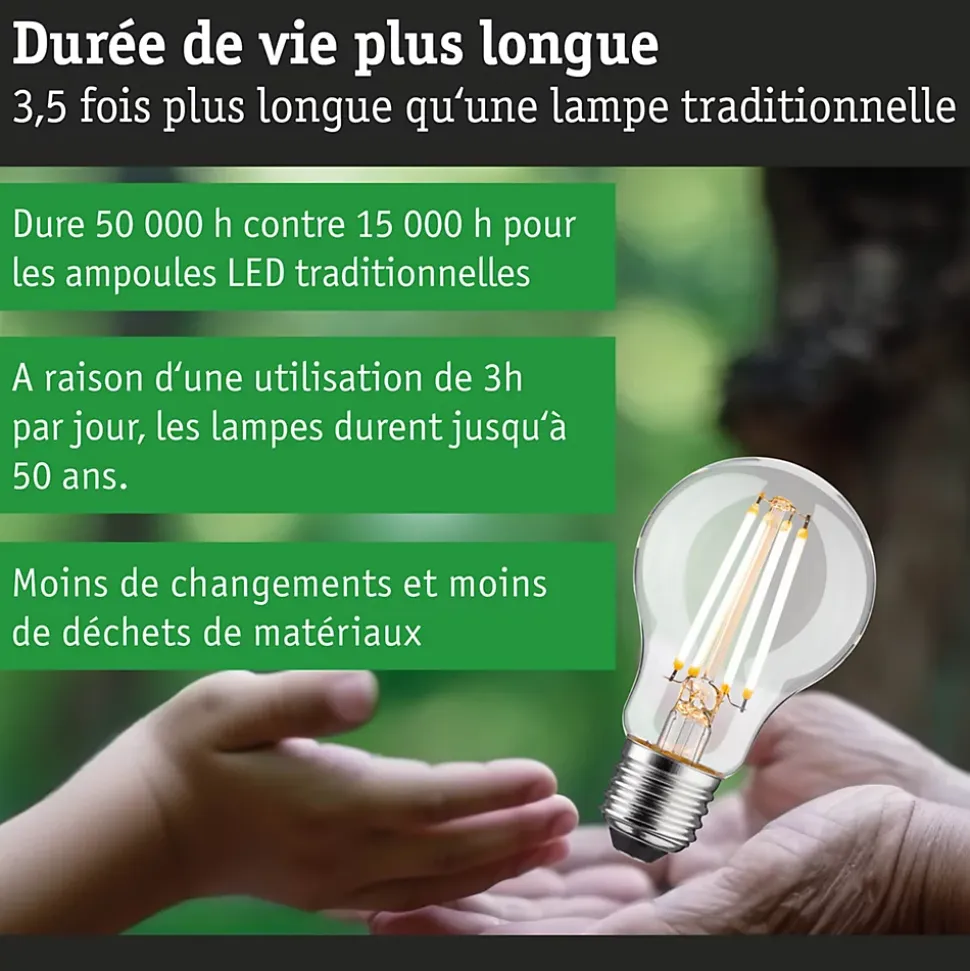 Les ampoules LED ultra efficaces de la gamme LED Eco-Line allient technologie innovante et durabilité pour un éclairage efficace et stylé. La consommation d’énergie réduite de 60% et la durée de vie nettement plus longue que les ampoules LED standard permettent de réduire considérablement les coûts énergétiques tout en préservant l’environnement. L’ampoule LED à filament claire s’adapte à toutes les douilles E27 courantes et produit, avec 3000K, une puissance de 5,7W, une lumière blanc chaud agréable sans teinte verte. Même les grands abat-jour sont éclairés de manière uniforme, ce qui apporte à chaque pièce une ambiance de bien-être harmonieuse. Selon les besoins, l’intensité lumineuse de l’ampoule peut être graduée sur 3 niveaux à l’aide d’un interrupteur conventionnel. Le variateur dispose d’une fonction mémoire. Les ampoules LED Paulmann portant le label Eye friendly produisent une lumière confortable qui préserve les yeux. Que ce soit pour travailler, lire ou se détendre, les ampoules contribuent à un meilleur confort visuel.