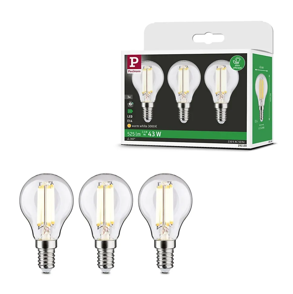 Les ampoules ultra efficaces de l’Eco-Line combinent innovation et durabilité. Grâce à une consommation d’énergie réduite de 60 % et à une durée de vie résolument plus longue que celle des ampoules LED standard, il est possible de réduire considérablement les coûts énergétiques tout en préservant l’environnement. Les sphériques à filament claires avec 3000 K, une puissance de 3×2,5 W et 3×525 lm diffusent un éclairage uniforme agréable sans teinte verdâtre. Les ampoules sont compatibles avec les douilles E14 conventionnelles. Grâce à leur forme compacte, les ampoules sphériques sont idéales pour les petits luminaires. Le pack multiple a cela de pratique qu’il permet d’équiper directement plusieurs luminaires pour illuminer une pièce entière.