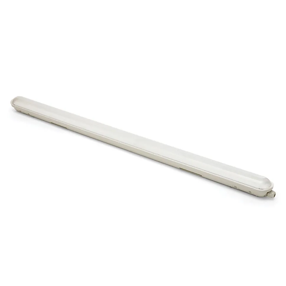 Plafonnier étanche IP65 avec LED intégrées 55W, 7150lm, super lumineux; longueur: 148cm. driver inclus; structure et diffuseur en polycarbonate; produit de longue durée. Température de lumière: 4000K; IRC: 80; faisceau: 120 °; Durée de vie des LED: 30 000 heures. Excellent pour les environnements humides tels que garage, cave, buanderie; convient aux zones extérieures exposées aux jets d’eau directs et à la pénétration de fines poussières. Résistant (IK08) et certifié TUV. Équipé d’un presse-étoupe d’entrée et de sortie pour un montage en série.