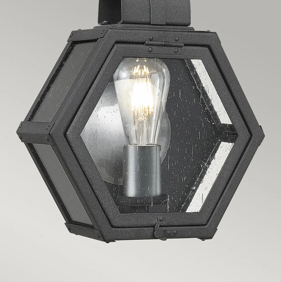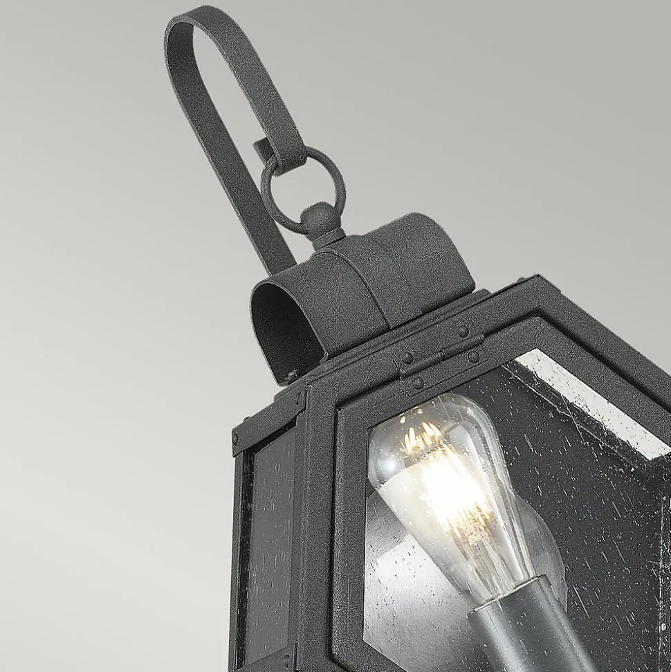 Elstead Quoizel Heath Lanterne murale d’extérieur noir chiné, IP44Finition : Noir tachetéMatériau : aluminium, laiton, acier, verre granuleux transparentClassement IP : IP44Hauteur : 41,8 cmLargeur : 26,7 cmProfondeur : 12,5 cmType de lampe : E27Nombre de lampes : 1Ampoule incluse : NonPuissance (max): 40W