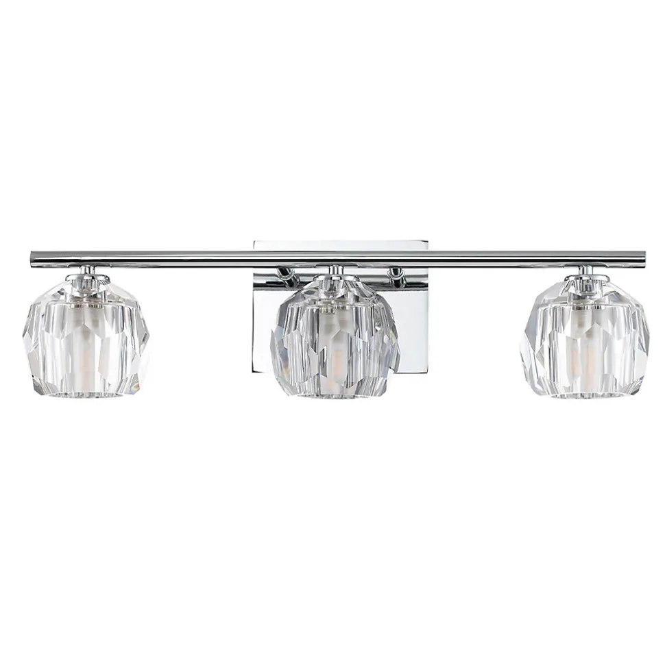 Elstead Quoizel Regalia Applique Chrome Poli, 3000K, IP44Finition : Chrome poliMatériau : acier, verre cristal K9Classement IP : IP44Hauteur : 15,2 cmLargeur : 55 cmProfondeur : 16,6 cmType de lampe : G9Nombre de lampes : 3Ampoule incluse : OuiKelvin : 3 000 kLumens : 900LmPuissance (max): 3W