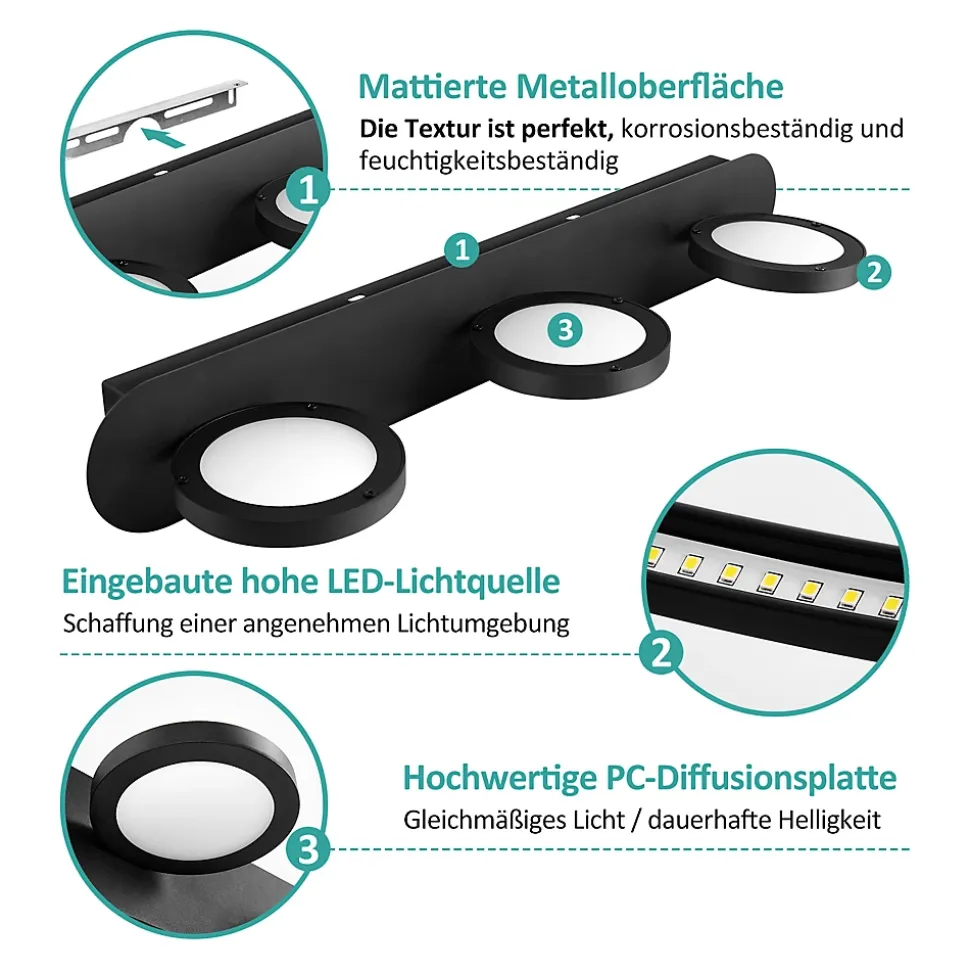 Les appliques murales LED EMKE allient innovation et design pour répondre aux besoins d’éclairage des salles de bain modernes. Avec une technologie LED avancée, elles assurent une lumière efficace tout en économisant de l’énergie. Que ce soit pour se préparer le matin ou créer une atmosphère relaxante en soirée, elles apportent une solution d’éclairage fiable et élégante.1. Dimensions élégantes : mesurant 50 cm de longueur, avec une base de 44,2 x 5,6 cm et un diamètre de tête de lampe de 10 cm (diamètre intérieur 7,6 cm), cette lampe est conçue pour compléter n’importe quel miroir ou mur de salle de bain.2. Éclairage optimal : fournit une lumière blanche naturelle stable de 4000 K avec une puissance de sortie de 15 W, fournissant environ 975 lumens pour un éclairage lumineux et uniforme. L’indice de rendu des couleurs élevé (> 80 Ra) garantit une clarté des couleurs réaliste.3. Certifié sûr et fiable : dispose d’un pilote à courant constant isolé IC qui répond aux normes de certification CE, offrant sécurité et efficacité énergétique.4. Finition mate moderne : fabriquée avec une finition noire mate pour un look élégant et contemporain, cette lampe s’intègre parfaitement dans divers styles de décoration de salle de bain.5. Installation facile : l’assemblage de la lampe miroir de salle de bain est simple : fixez-la au mur, connectez les fils et le tour est joué. Convient comme lampe de maquillage dans la chambre ou comme applique murale de salle de bain.