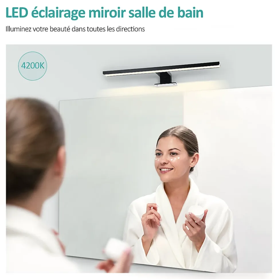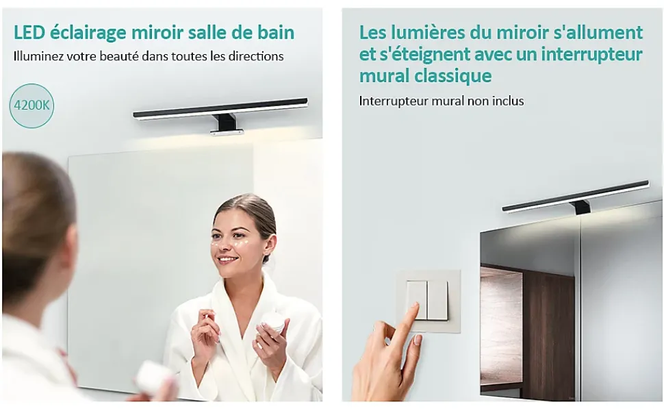 Offrez à votre salle de bain un éclairage à la fois fonctionnel et esthétique avec les appliques murales LED EMKE. Conçues pour diffuser une lumière agréable et sans éblouissement, elles améliorent la visibilité et créent une ambiance raffinée. Faciles à installer et conçues avec des matériaux de qualité, elles sont idéales pour un usage quotidien et durable.1. Large compatibilité de tension : fonctionne en douceur avec une plage de tension de 85-260 V, garantissant des performances fiables dans divers paramètres.2. Trois options d’installation : fixez la lampe de miroir à votre miroir (convient aux miroirs d’une épaisseur de ≤ 8 mm), fixez-la à votre armoire à miroir ou montez-la directement sur le mur.3. Interrupteur d’éclairage de miroir : la lampe de miroir est connectée directement au câble et peut être utilisée avec un interrupteur mural dans votre maison (remarque : lampe de miroir sans interrupteur), 8 W | 4200 K, peut également être utilisée comme éclairage supplémentaire.4. Économie d’énergie : cette lampe de miroir offre une excellente efficacité énergétique tout en s’intégrant harmonieusement à divers styles de décoration grâce à son design épuré et moderne.5. Fiable : nous vous proposons des services de haute qualité pour vous assurer une expérience d’achat fluide. Si vous rencontrez des problèmes, n’hésitez pas à nous contacter à tout moment pour obtenir de l’aide après-vente.
