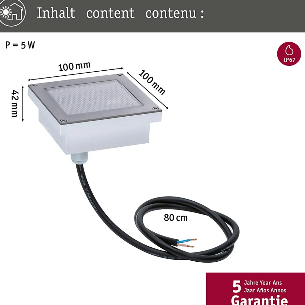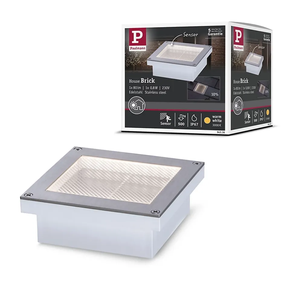 L’encastré sol Brick en Métal/Acier et dimensions 100 mm x 100 mm x 38 mm commence à briller dès la nuit tombée. Il crée un balisage qui joue le rôle de lumière fonctionnelle lorsque le détecteur de mouvement signale des personnes à proximité. Ces fonctions sont réglables à l’aide du commutateur situé sur le luminaire. Il est quasiment invisible, si bien que l’œil ne perçoit qu’une surface lumineuse uniforme. Cet encastré de sol est, grâce à l’indice de protection IP67, étanche et inoxydable, il est adapté aux zones accessibles en plein air – l’éclairage résiste sans problème jusqu’à un poids de 500 kg. Avec une température de couleur agréable de 3 000K ce spot encastré s’illumine dans l’obscurité.