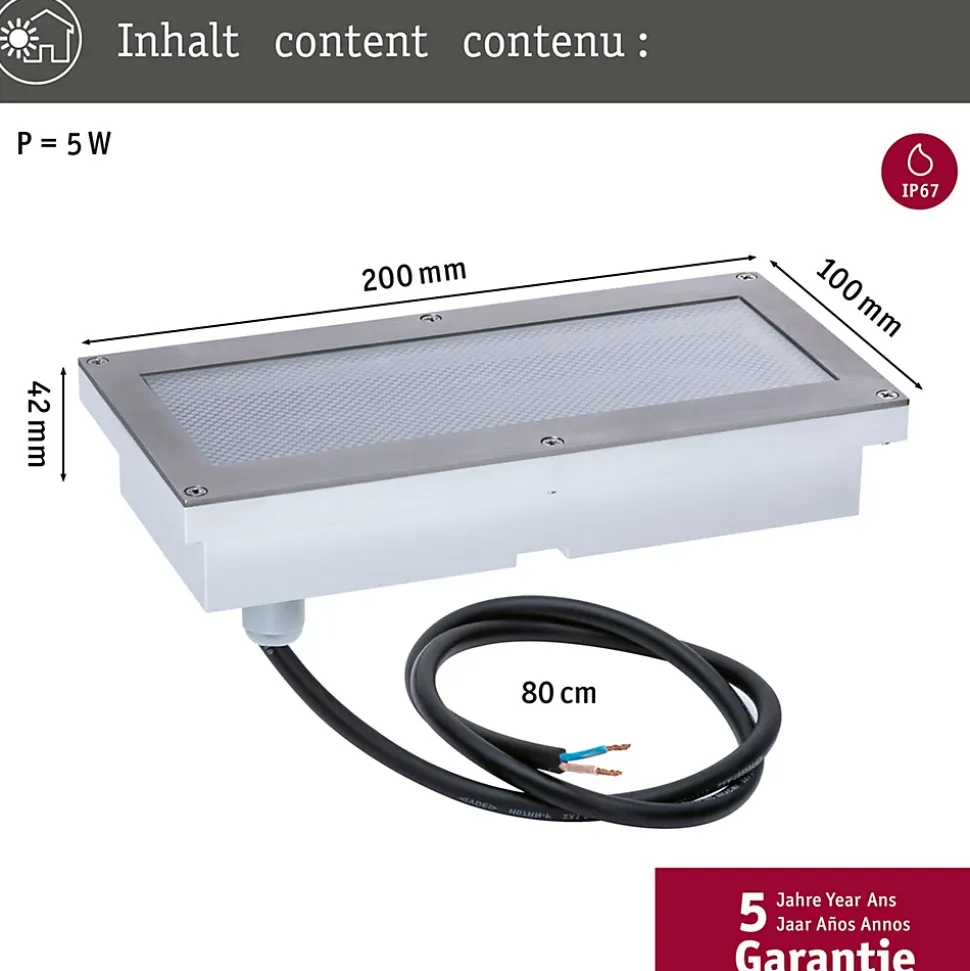 L’encastré sol Brick en Métal/Acier inoxydable et dimensions 100 mm x 200 mm x 38 mm commence à briller dès la nuit tombée. Il crée un balisage qui joue le rôle de lumière fonctionnelle lorsque le détecteur de mouvement signale des personnes à proximité. Ces fonctions sont réglables à l’aide du commutateur situé sur le luminaire. Il est quasiment invisible, si bien que l’œil ne perçoit qu’une surface lumineuse uniforme. Cet encastré de sol est, grâce à l’indice de protection IP67, étanche et inoxydable et il est adapté aux zones accessibles en plein air – le luminaire résiste sans problème jusqu’à un poids de 500 kg. Avec une température de couleur agréable de 3 000K ce spot encastré s’illumine dans l’obscurité.