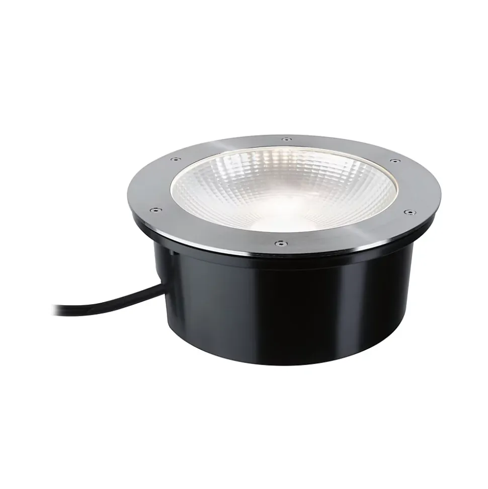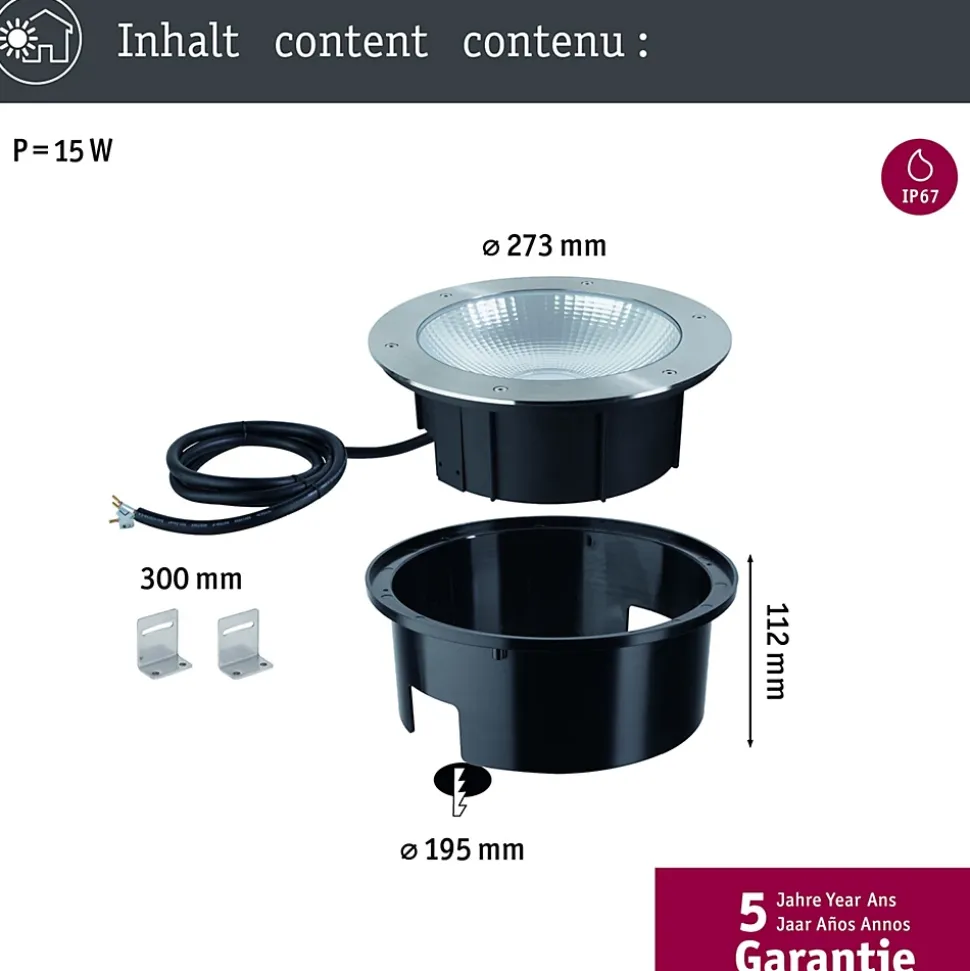 Que ce soit pour une façade, un accès ou l’allée vers la maison, le spot LED encastré dans le sol Durea avec son diamètre de 273 mm illumine surement l’espace extérieur souhaité. Grâce à une charge supportée élevée de 2000 kg, cet encastré de sol convient parfaitement pour les espaces extérieurs praticables. Inoxydables, hydrofuges et protégés contre la poussière, ils diffusent une lumière blanc chaud quelles que soient les conditions météorologiques. Le module LED intégré peut être remplacé à volonté par un spécialiste. Grâce au raccordement sans outils par les clips de fixation rapides des spots encastrés dans le sol, il est rapide et facile de monter plusieurs projecteurs à la suite. L’avantage est de ne pas devoir brancher chaque lampe de sol individuellement. Une gaine d’encastrement est fournie.