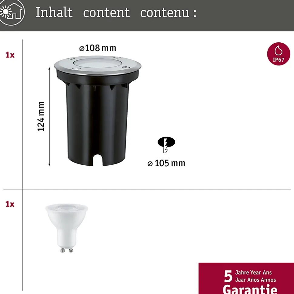 Indice IP : IP 67 – Protection contre les immersions temporaires|Ampoule LED amovible incluse|Pour raccordement direct au secteur 230V|Charge maximale 500 kg