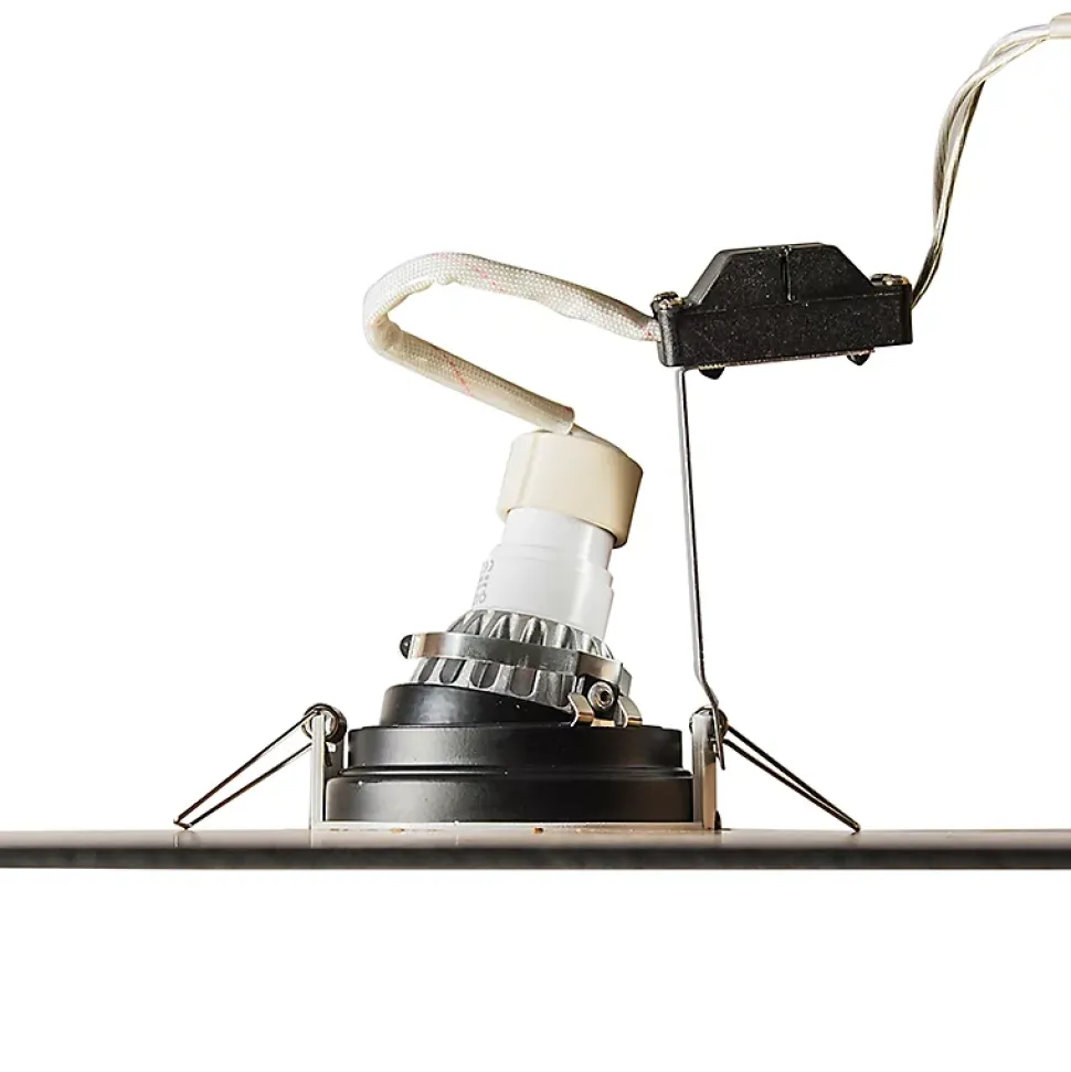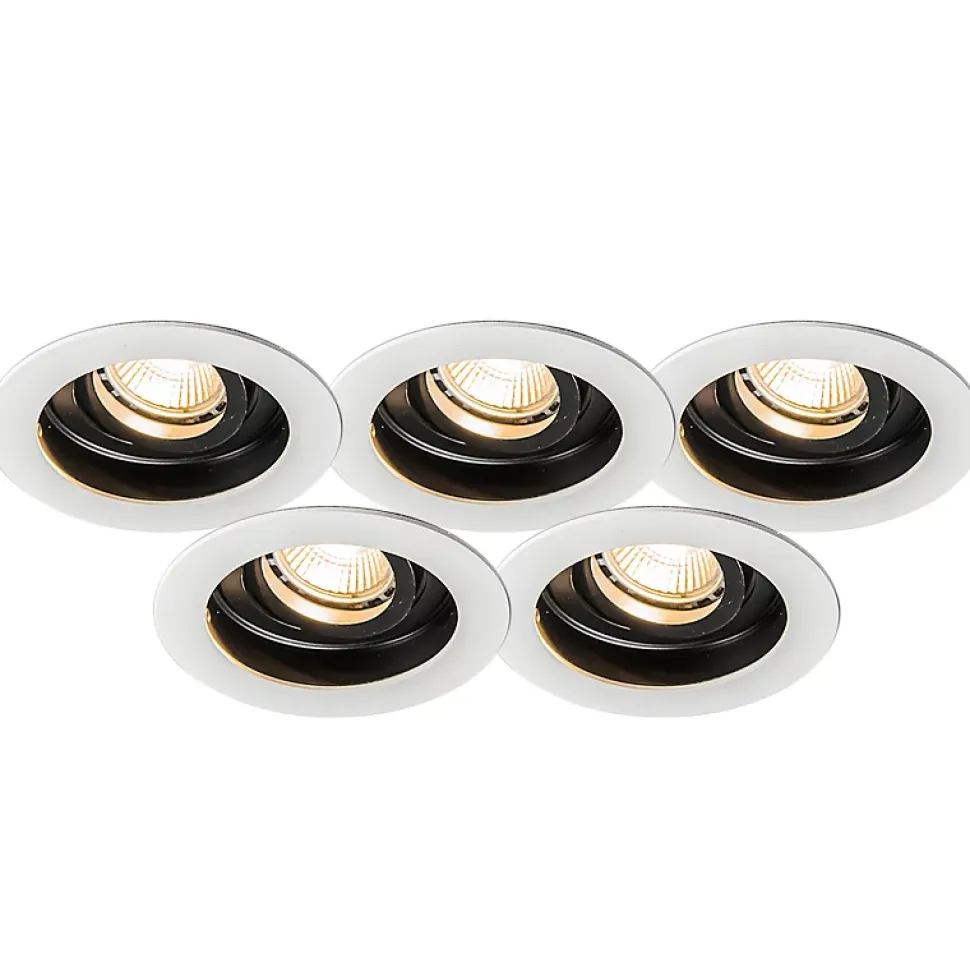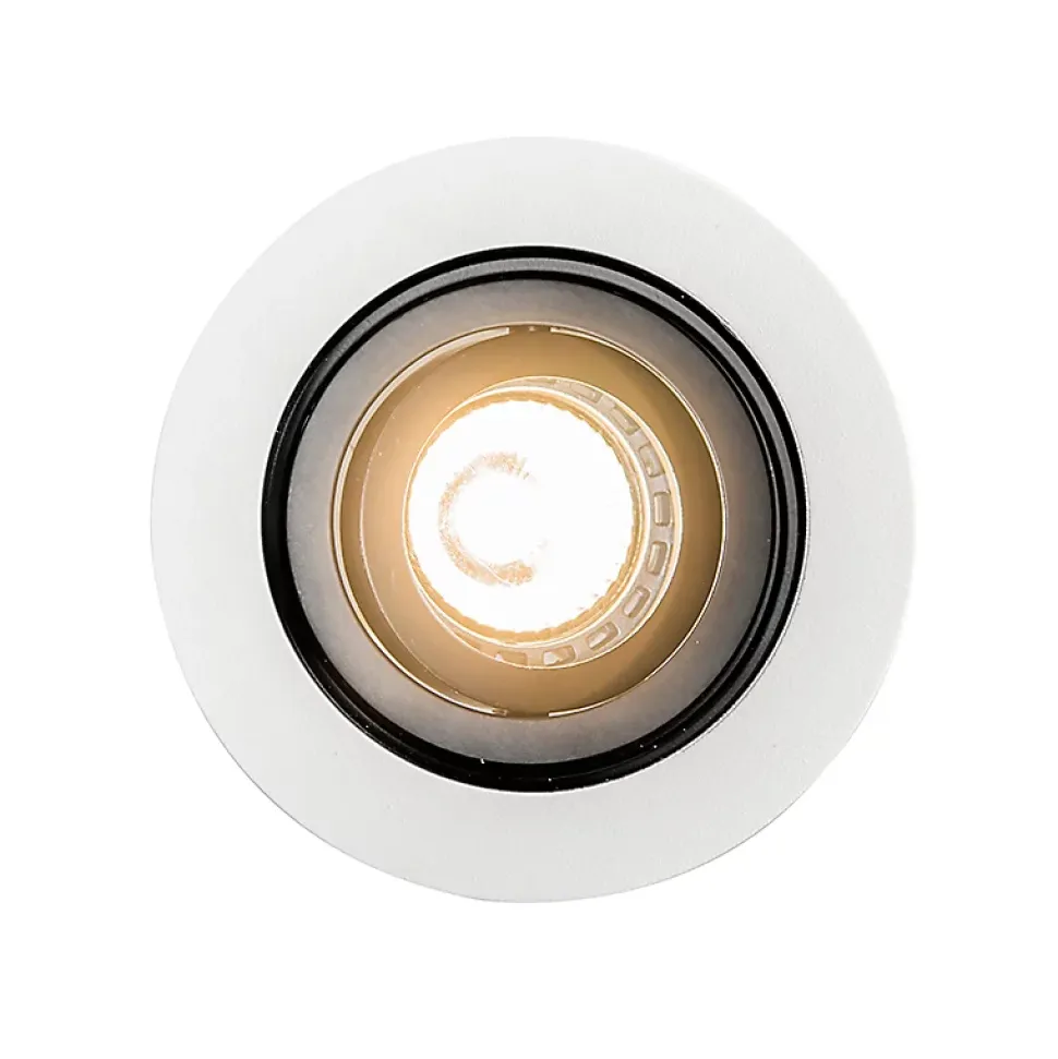 Le Rondoo s’intègre parfaitement dans un environnement moderne grâce à sa forme, l’utilisation de l’aluminium et sa finition blanche. Un spot intemporel ! Il trouvera parfaitement sa place dans la cuisine ou dans l’entrée. Autre atout de ce spot encastré : il est inclinable, ce qui vous permet de décider de la direction du faisceau lumineux. Le Rondoo est livré avec des ressorts de serrage ! Vous pouvez ainsi le fixer au plafond. Le diamètre de la lampe est de 10,4 cm. La profondeur de l’encastrement est de 12 cm et son diamètre de 9 cm. Vous pouvez compléter la lampe avec une ampoule à culot GU10 (50W maximum), mais celle-ci doit être commandée séparément. La luminosité peut être atténuée à l’aide d’un variateur externe (non inclus). Optez pour la modernité avec le Rondoo ! Encore plus abordable en lot de 5.