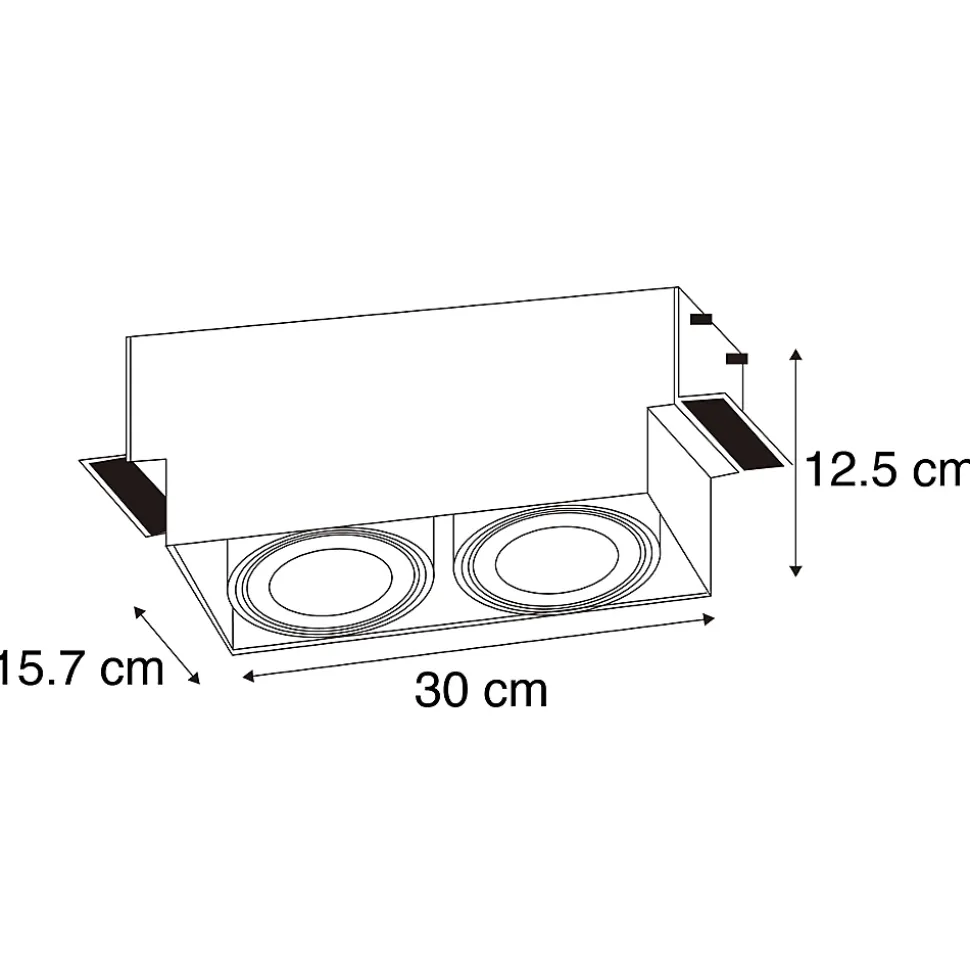 Un éclairage de base parfait pour votre maison, ce spot encastré Oneon. Vous apporterez un design élégant et luxueux dans votre maison. Il a une largeur de 15,6 cm et une longueur de 29,9 cm. Les dimensions de ce spot pour l’installation : profondeur 12,5 cm, longueur 30 cm. Le luminaire est sans bordure. Cela signifie qu’il n’y a pas de bord extérieur autour du luminaire, vous pouvez donc parfaitement et en toute transparence intégrer ce luminaire dans votre plafond en plaques de plâtre ou en stuc. Le spot encastré est en acier et fini dans une couleur noire intemporelle. Le spot encastré a deux douilles GU10. Commandez vous-même 12 ampoules GU10 AR70 d’un diamètre de 7 cm et complétez votre Oneon (chacune max. 50W). Les spots peuvent être inclinés séparément, vous pouvez donc choisir où vous voulez votre lumière ! Il est également dimmable (variateur non inclus). Un spot parfait comme éclairage de base dans le salon, la chambre ou la cuisine. Maintenant dans un ensemble de 12 !