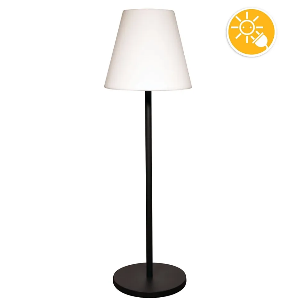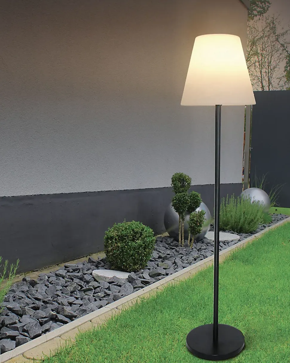 Lampe solaire LED : s’allume et s’éteint toute seule. Il suffit de la laisser dans le jardin : elle s’allume automatiquement dans l’obscurité et s’éteint pour se recharger pendant la journée. Il suffit de le laisser dans un endroit ensoleillé. Vous pouvez également la recharger via le port USB (intégré). Munie de LED RGB, vous aurez le choix entre une lumière blanche chaude 3000 K (idéale pour l’extérieur) et 7 autres couleurs pour divertir vos invités. Choix via la télécommande fournie (rouge, vert, bleu, jaune, violet, cyan, rose). 300 lumens. Lampadaire au design exclusif avec une hauteur de 151,5 cm. Design simple et épuré, adapté à la fois au style de vie moderne et classique. Construction solide et robuste. Indice de protection IP66 pour une utilisation en intérieur et en extérieur. Sans fil. Abat-jour en plastique PE. Émission de lumière homogène et accueillante. Base et tube en métal. La surface revêtue par pulvérisation offre une excellente protection contre la corrosion. Couleur : tube et base : gris foncé, couleur : blanc opale. Dimensions : H : 151,5 cm, Ø abat-jour : 35 cm, H : 30 cm, Ø abat-jour : 30 cm. La livraison comprend : lampe de sol, télécommande multifonction. Utilisation polyvalente, par exemple dans le jardin, sur la terrasse, dans le jardin d’hiver, dans la zone de jour, dans les foires et les expositions, dans la vitrine et plus encore. Peut être installé en tant qu’appareil unique ou en groupe.