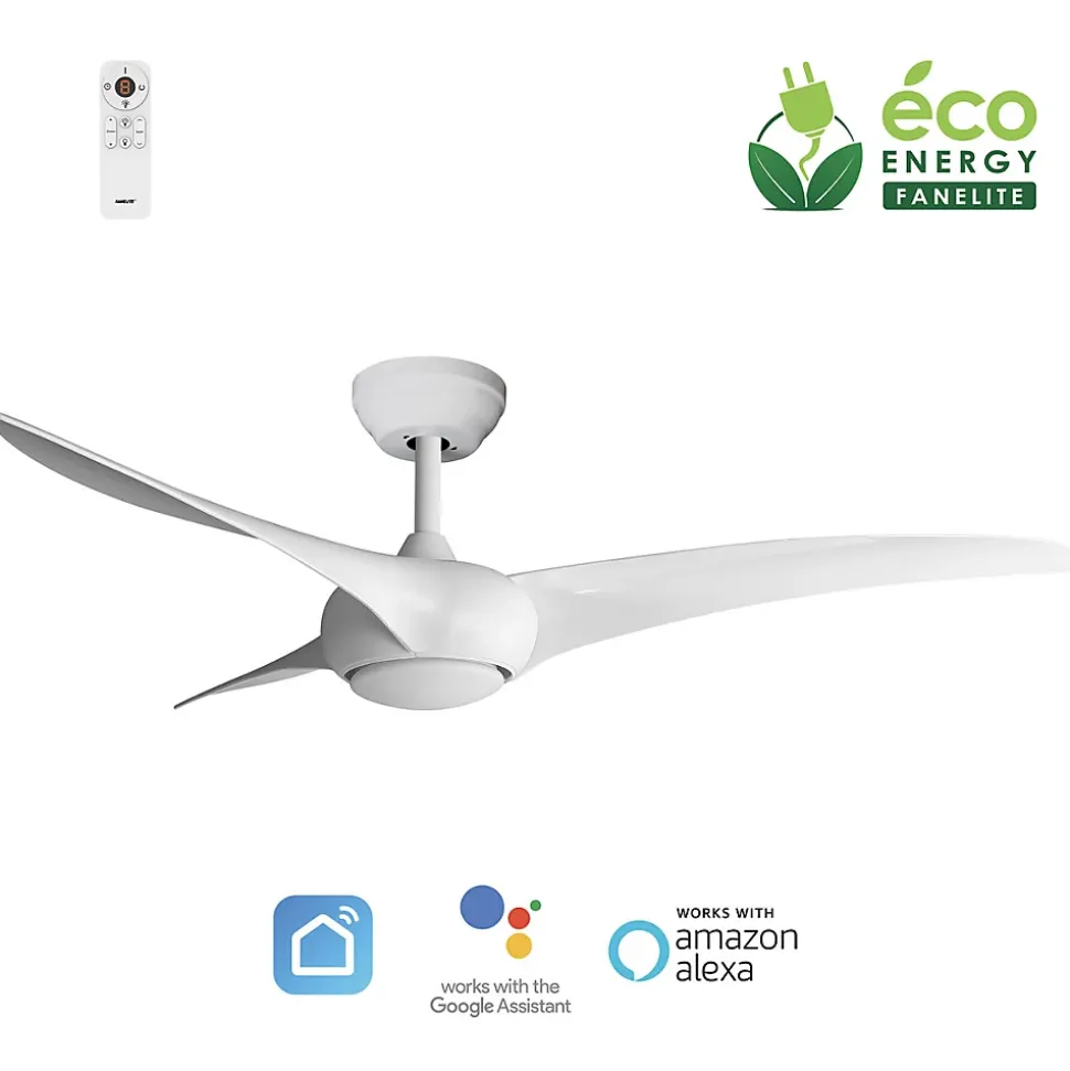 Brasseur d’air blanc DC 132 cm, 3 pales plastiques ABS, avec télécommande 6 vitessesMoteur à Courant Continu, très faible consommation (4 W en vitesse 1 à 38 W en vitesse 6), très silencieux (27 dB en vitesse 1 à 45 dB en vitesse 6), très fort débit d’air (5 428 m3/h en vitesse 1 à 11 460 m3/h en vitesse 6)Lumière LED 20W 3 couleurs à intensité variable (6000°K / 4000°K / 3000°K)Compatible Wifi (Application gratuite d’objets connectées Smart Life), compatibilité contrôles vocaux (Google Assistant, Amazon Alexa)Avec connecteurs de fils, connexions simplifiées, installation facile – Pas de condensateur ni fusible thermiqueTubes inclus 13 et 25 cm, rallonges 90 cm ou 120 cm disponibles en optionAvec tube inclus de 13 cm : Hauteur Plafond / Pales = 22 cm – Hauteur Plafond / Point bas = 33 cmAvec tube inclus de 25 cm : Hauteur Plafond / Pales = 34 cm – Hauteur Plafond / Point bas = 45 cmMode été / hiver (changement du sens de rotation des pales) pour utilisation en été (économie climatisation) et en hiver (économie chauffage)