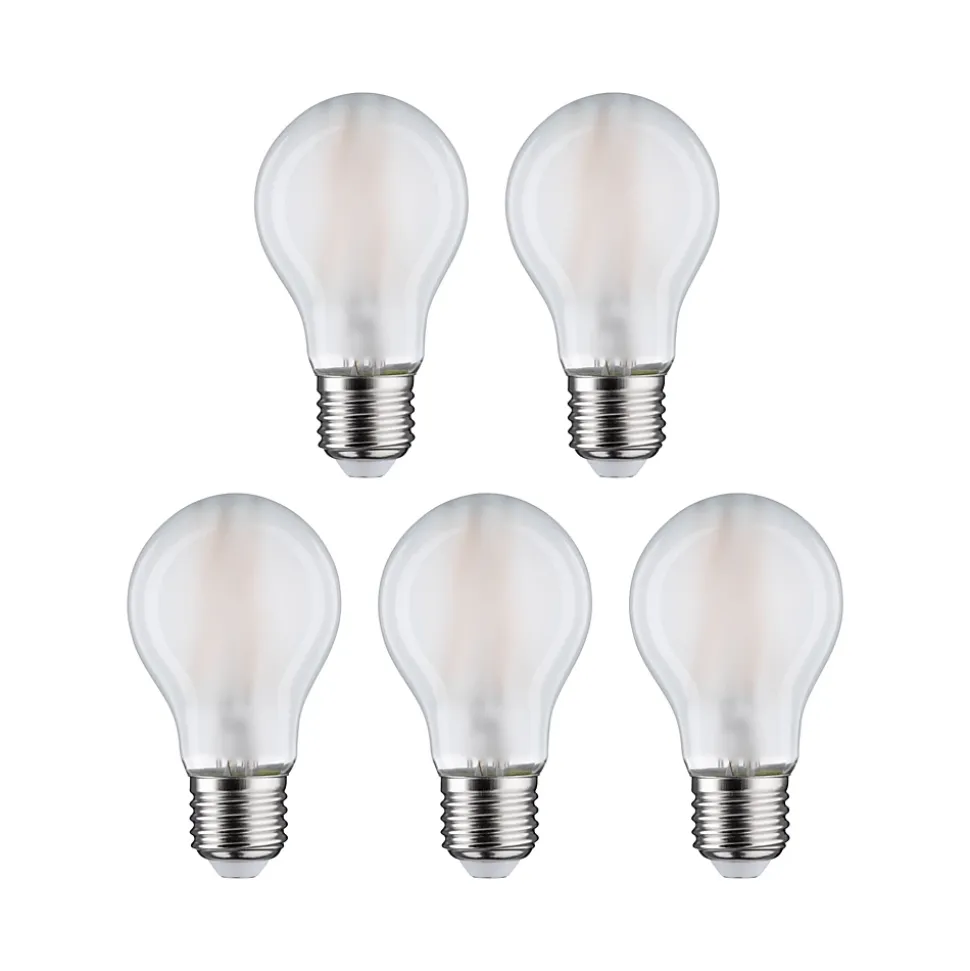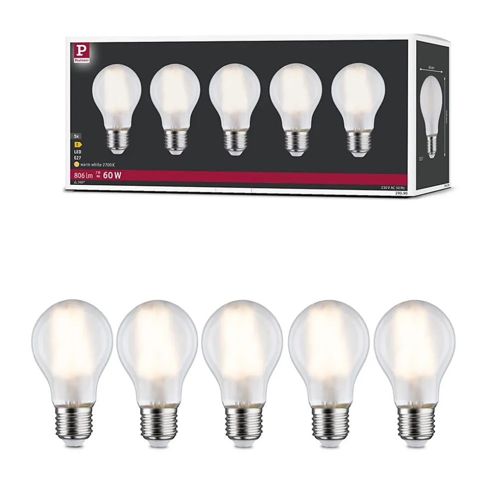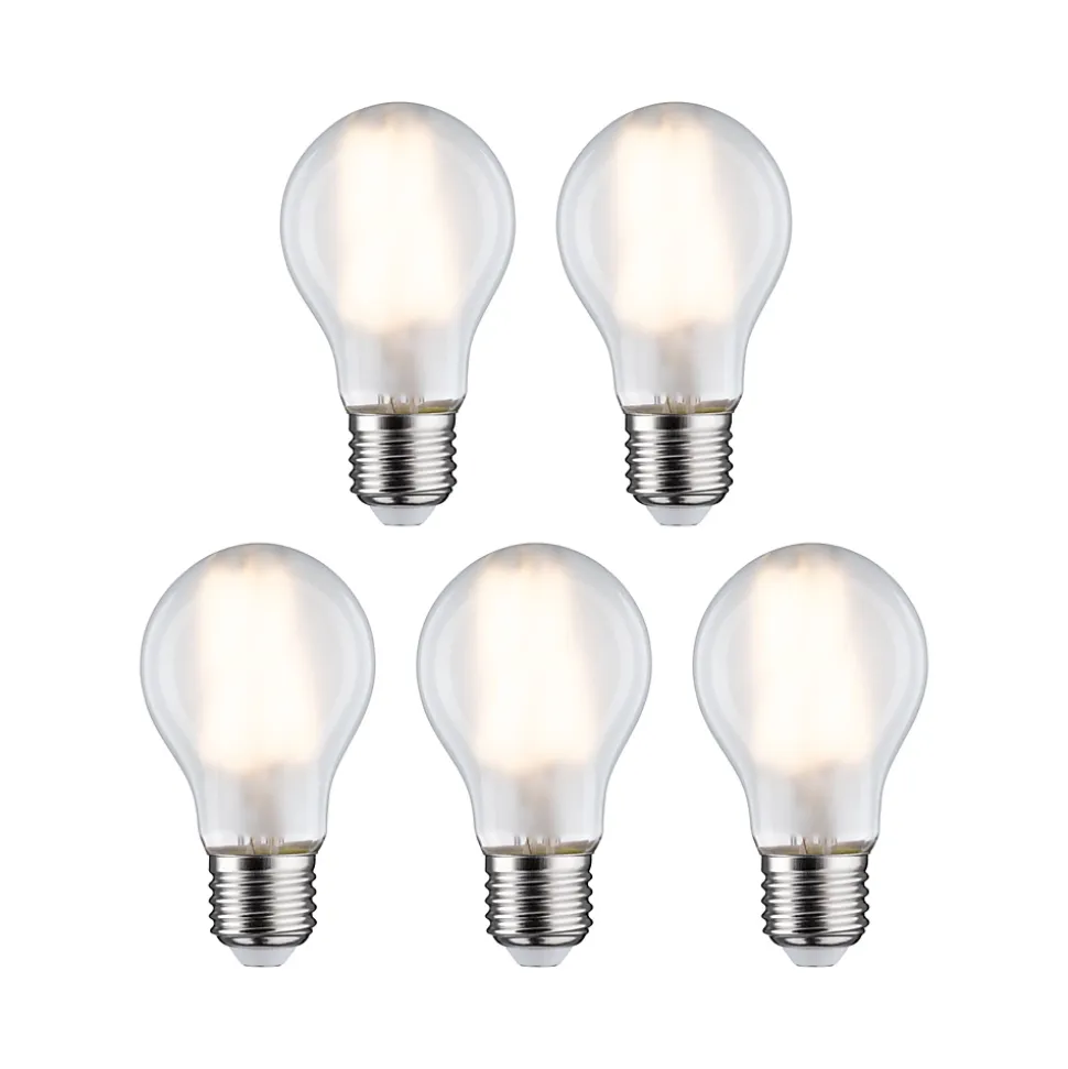 Les ampoules LED à filament (lot de 5) avec 2700K, une puissance de 5x7W et 5x806lm diffusent une agréable lumière blanc chaud. Les ampoules sont compatibles avec les douilles E27 conventionnelles. Éclaire de façon uniforme même les plus grands abat-jour. Les lampes LED Paulmann portant le label Eye friendly produisent une lumière confortable qui préserve les yeux. Que ce soit pour travailler, lire ou se détendre, les lampes contribuent à un meilleur confort visuel.