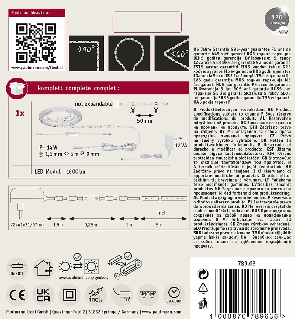 Kit prêt à fonctionner fourni avec alimentation 230/12V, câble d’alimentation et fiche secteur|Face arrière autocollante pour un montage simple|Peut être raccourci en fonction de la longueur souhaitée (aux endroits marqués)|Aucun accessoire n’est nécessaire|Avec interrupteur Marche/Arrêt/variation d’intensité intégré|Intensité variable|Divers effets lumineux réglables par commutateur