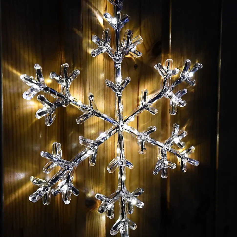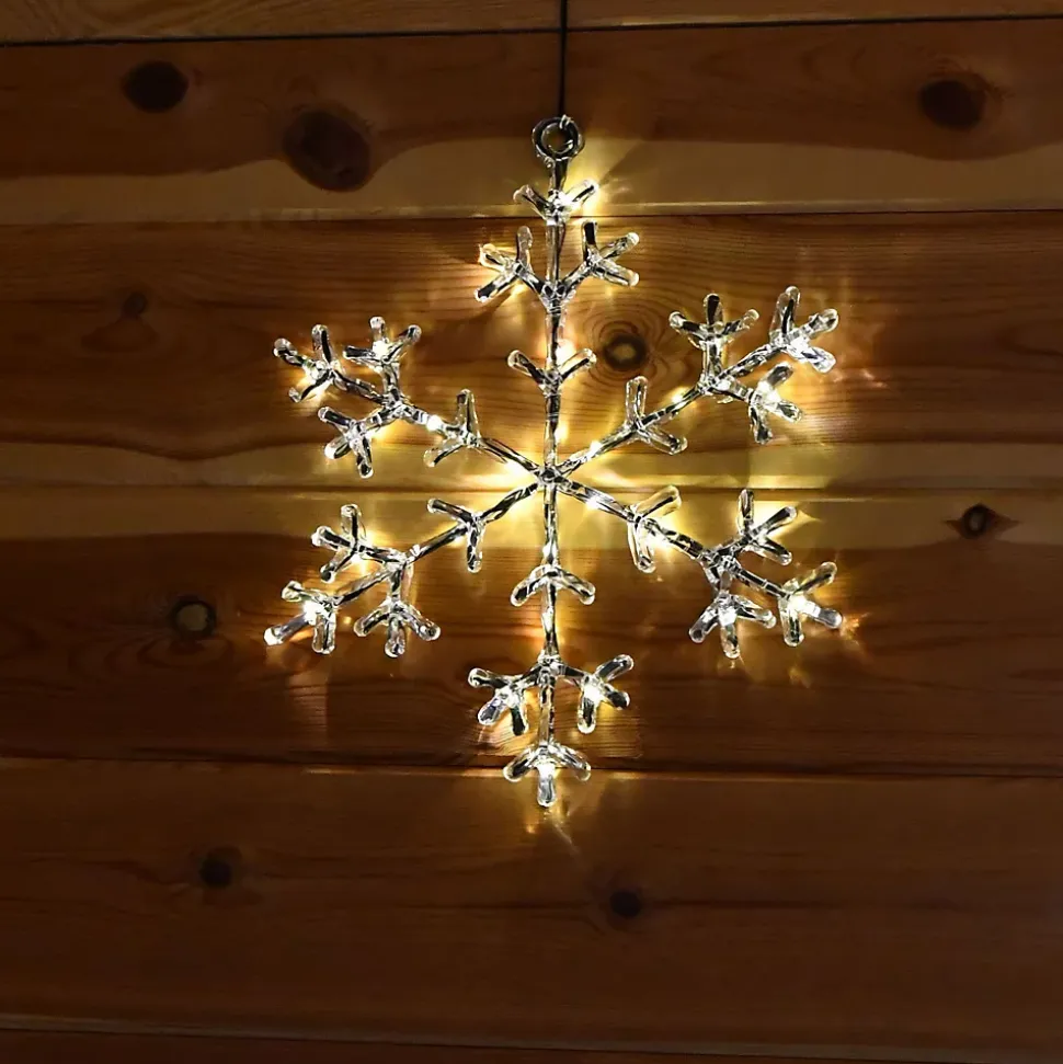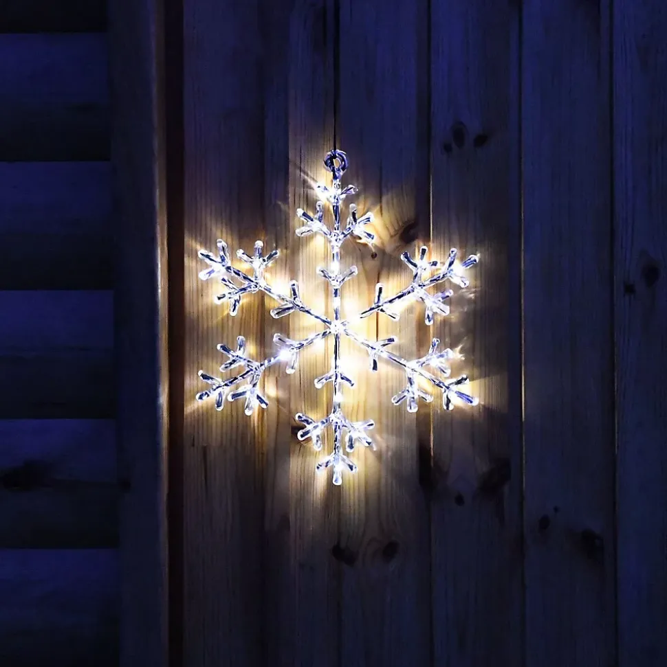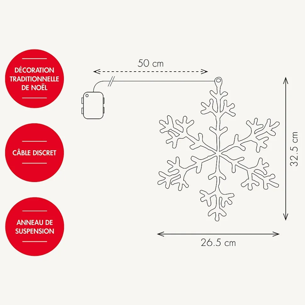Apportez une ambiance hivernale et scandinave à votre décoration avec ce joli flocon givré lumineux. Placez-le sur votre cheminée, votre mur ou à vos fenêtres et transformez votre intérieur ou extérieur en un univers hivernal.• Nb de LED : 30 microLED• Couleur de LED : Blanc chaud• Couleur du câble : Câble transparent• Animation : Fixe• Luminosité : 90 lumens• Dimensions : L26.5 x H32.5cm• Alimentation : A piles, 3 piles AA 1,5V Alkaline, non incluse(s)• Timer : Oui minuteur 6h en marche et 18h à l’arrêt• Prolongaeble : Non• Matière(s) : Structure en métal• Usage : Intérieur/Extérieur• Indice de protection : IP44• Garantie : 2 ansUsage & installation :Utilisation intérieure et extérieure. L’indice IP44, vous garantit une utilisation extérieure quelque soit la météo tout au long de l’année. Le boitier de piles est adapté pour une utilisation extérieure. Vous pouvez utiliser la fonction Timer pour éviter d’éteindre votre flocon manuellemement.Données techniques & dimensions :Ce flocon glacé sur piles mesure 26.5 cm de largeur et 32.5 cm de hauteur. Il contient un anneau de suspension pour faciliter sa suspension. La structure est en métal recouverte d’acrylique ce qui donne cet effet glacé. Il fonctionne avec 3 piles AA 1,5V non fournies. La distance du câble d’alimentation entre le boitier et l’anneau de suspension est de 50cm.Source lumineuse :Ce flocon glacé est composé de 30 microLED blanc chaud fixe.