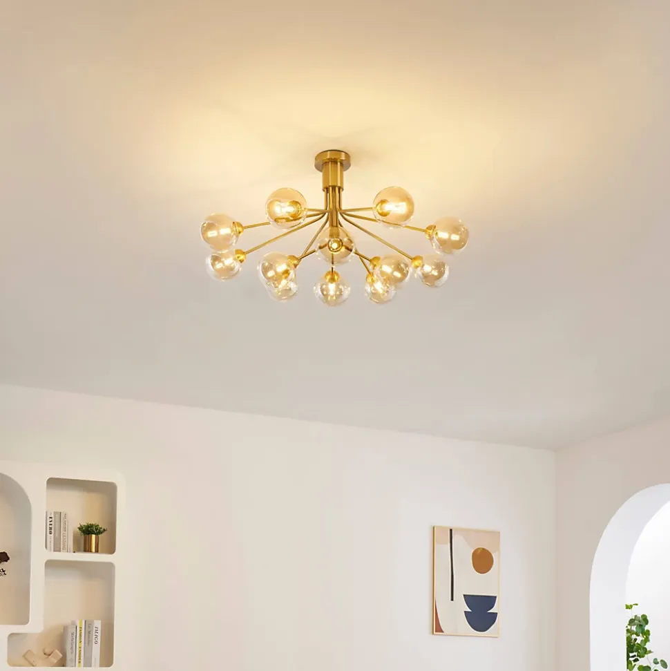 Audrey est une suspension raffinée avec une finition en laiton, mettant en valeur 12 boules ambrées. Pour un éclairage optimal, elle doit être complétée de 12 ampoules G9 (non incluses). Sa hauteur est ajustable, ce qui lui permet de s’adapter à différentes pièces tout en diffusant une lumière généreuse. Son design moderne ajoute une touche de charme et de sophistication, et Audrey peut être transformée en plafonnier en retirant sa barre.) Assemblage à faire par vos soins (