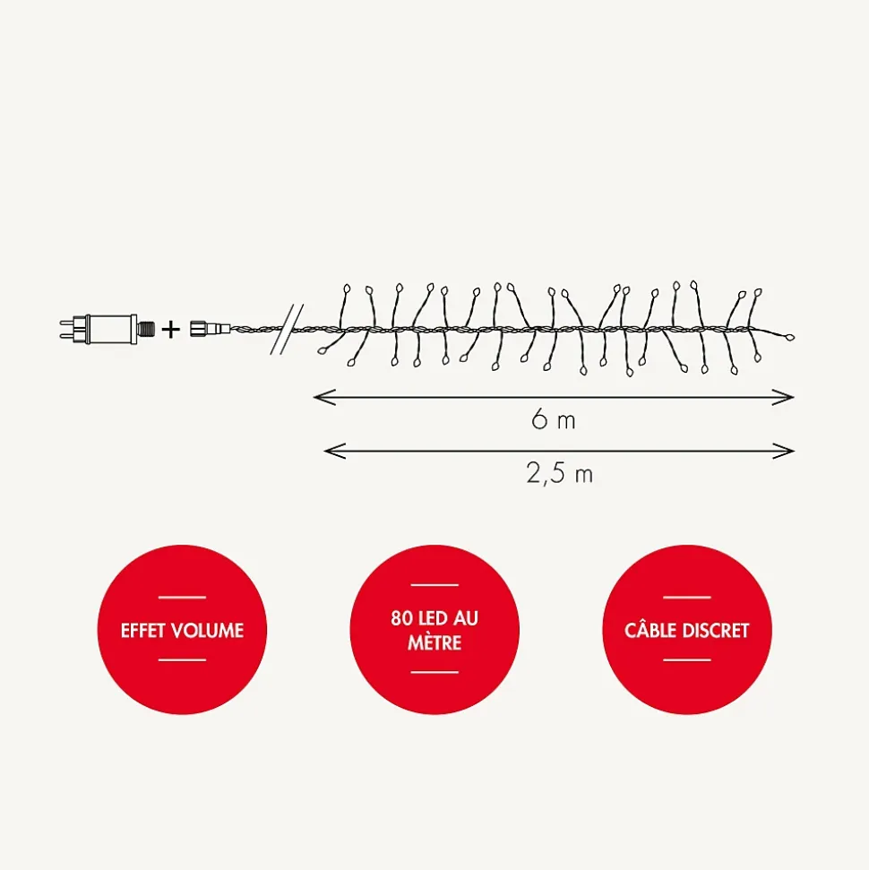 Idéale en DIY autour d’un cadre, d’une échelle ou encore dans un vase, laissez parler votre créativité ! Sa grande longueur et sa luminosité réveilleront vos soirées.• Couleur de la lumière : Ivoire• Nombre de LED : 480• Dimensions : L6m• Puissance : transformateur 230 V/20W• Alimentation : Filaire• Couleur du câble : vert• Matière : Produit en PVC souple câble sécurisé par un revêtement.• Connectable : non• Garantie : 2 ans Usage et installation : Cette jolie guirlande trouvera sa place partout. Son câble discret et ses mircoLED habilleront murs, ciel de lit, vases, arbres. Décorez avec finesse et élégance.Données techniques et dimensions : Dotée de l’indice de protection IP44, votre guirlande résistera à toutes les météos. Simple d’utilisation, il vous suffit de la brancher à une prise secteur. Source lumineuse : Cette guirlande est composée de 480 MicroLED nouvelles générations est trois fois plus lumineuses qu’une LED classique.Option: Cette guirlande existe en 2.5m câble argent.