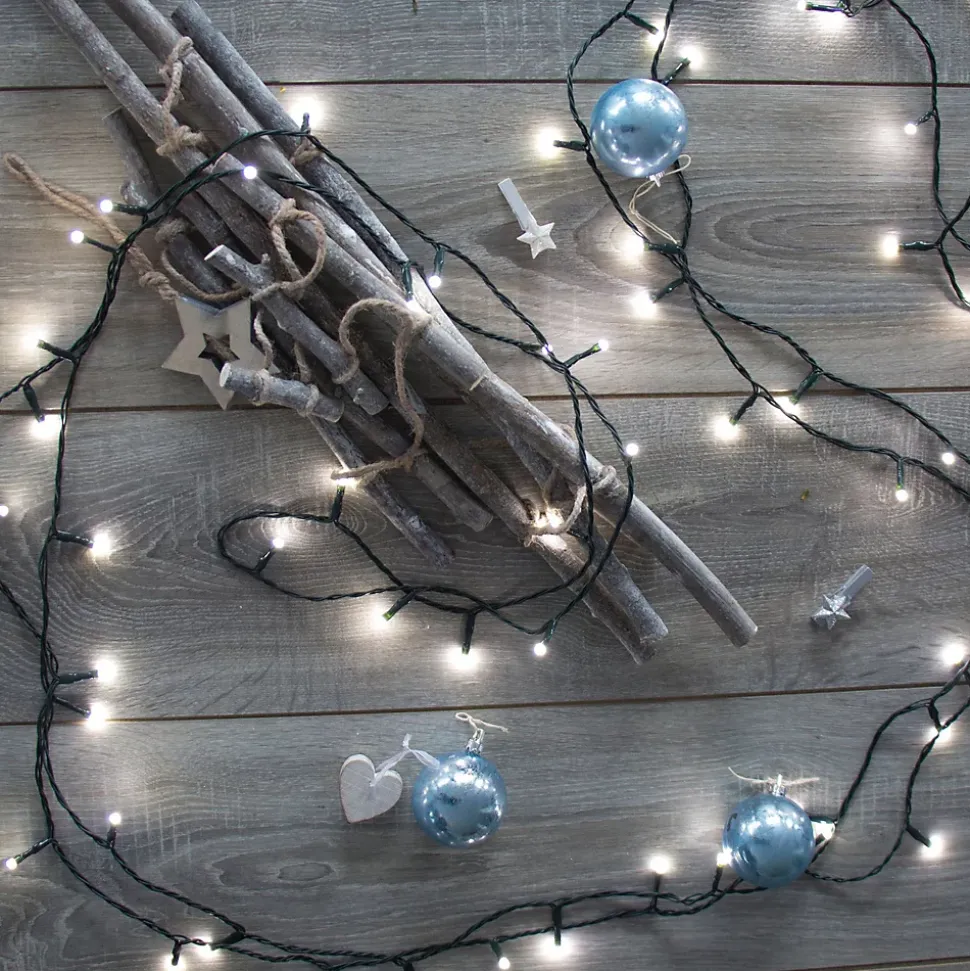 La délicate guirlande DOLCE forte luminosité sera parfaite pour décorer votre intérieur comme votre extérieur ! Elle est idéale pour créer une ambiance festive grâce à ses 8 animations. • Couleur de la lumière: Blanc froid• Nombre de LED : 80• Dimensions : L 8m, 2.5 cm entre chaque LED • Puissance : transformateur 230V/31V• Alimentation : Filaire• Couleur du câble : vert• Matière : Produit en PVC souple câble vert • Animation : 8 animations (flash scintillant, fixe, lent, partiel) • Connectable : non• Garantie : 2 ans Usage et installation : Cette jolie guirlande trouvera sa place aussi bien dans une chambre, un salon, dans un sapin que sous votre tonnelle, ou sur votre terrasse. Dotée de l’indice de protection IP44, elle résistera toute l’année à l’extérieur. Simple d’uilisation, il vous suffit de brancher à une prise secteur grâce au câble de 5m inclus.Données techniques : Guirlande basse tension, équipée d’un transformateur. Les LED sont espacées de 2.5cm.Source lumineuse : Cette jolie guirlande fonctionne avec 80 LED basse tension, puissance : 8,5W. Diffusion uniforme de la lumière à 360°. 8 animations sont disponibles pour personnaliser votre ambiance (Combinaison, par vagues, séquentielle, changement lent et partiel des LED, suite/flash, fondu lent, flash scintillant, fixe). Option : Vous pouvez retrouver cette guirlande sous différentes couleurs : Blanc chaud, rose et multicolore.