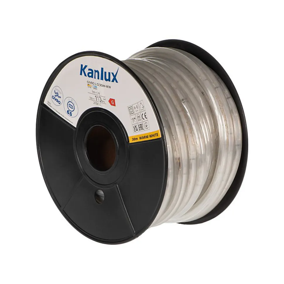 Les caractéristiques techniquesCette guirlande lumineuse peut être installée aussi bien à l’intérieur qu’à l’extérieur grâce à son coefficient d’étanchéité IP65.La partie éclairante mesure 30 mètres et le câble d’alimentation 1,5 mètre.Elle diffuse une lumière blanc chaud.Cet élément décoratif est également économique puisqu’il en consomme que 30 watts pour 3300 lumens d’éclairage.Cette guiralnde est ivrée avec son cordon d’alimentation (ref 38590) étanche également (IP44)Les avantages esthétiques Cette guirlande lumineuse décorative embellira aussi bien votre intérieur que votre extérieur car elle est étanche.En été, vous donnerez un aspect festif à votre terrasse ou votre jardin.Pour vos evènementiels en extérieur (mariage, fêtes de famille etc) cette guirlande décorative amènera de la magie à la soirée.A l’intérieur, vous pourrez entourer une rampe d’escalier ou une rambarde de mezzanine.La guirlande est livrée en bobine. Elle existe également en version 15 mètres. Vous pouvez relier ensemble plusieurs guirlandes (jusqu’à 100 métres).
