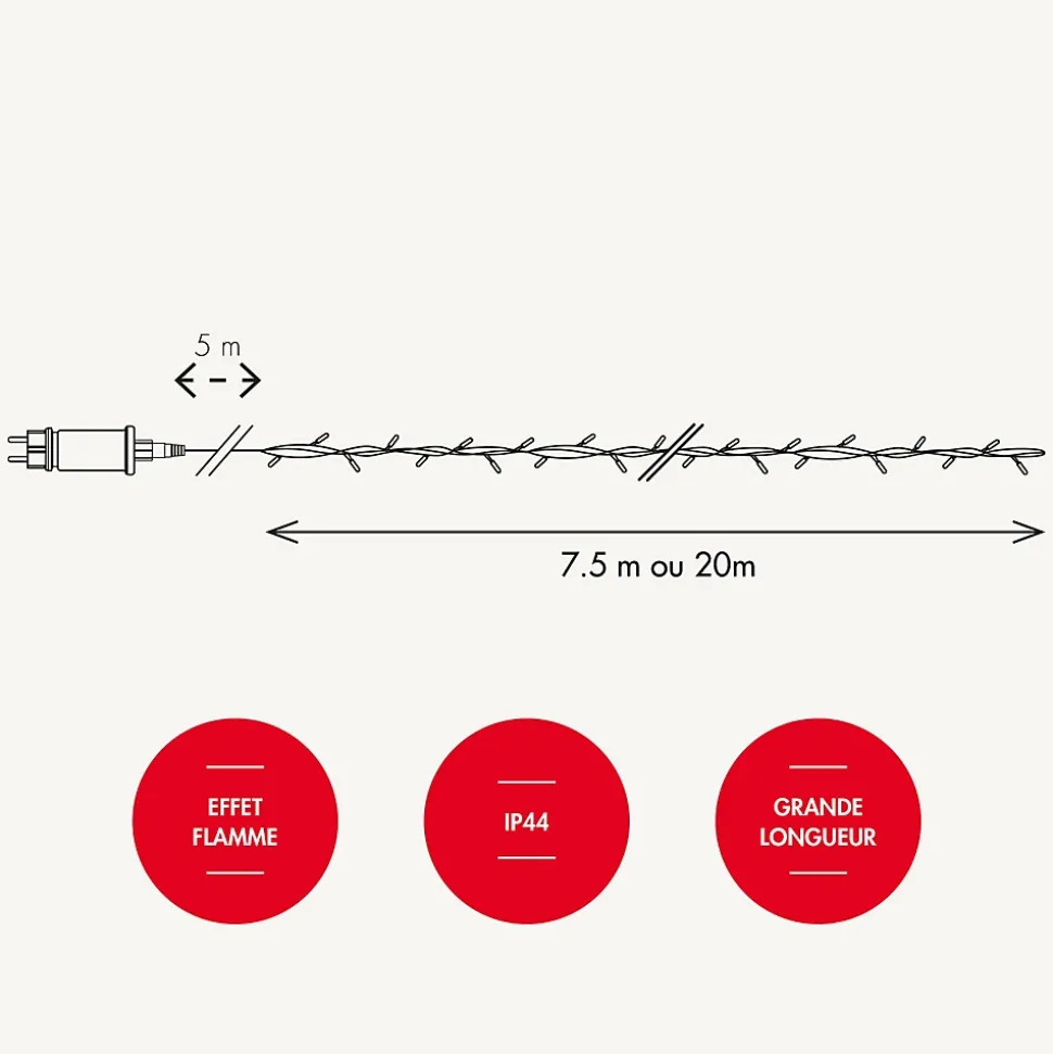 La guirlande Flammes vacillantes sera parfaite pour votre maison et son extérieur. Elle ajoutera une touche chaleureuse à tout lie. Combinez-les à votre sapin ou à des arbustes pour apporter une touche d’éclat grâce à son effet de flammes vacillantes.• Couleur de la lumière : Ambre• Nombre de LED : 300• Animation : effet flamme vacillantes• Dimensions : L7.5m• Alimentation : Filaire 9W/230V • Couleur du câble : vert foncé• Matière : Produit en PVC souple• Utilisation : Intérieur/ Extérieur• Garantie : 2 ansUsage et installation : Simple d’installation, une fois installée branchez la guirlande sur secteur. Plusieurs usages possibles ; à installer dans un sapin, dans une chambre, dans un salon, sur une terrasse, autour d’un palmier…Données techniques et dimensions : Cette guirlande dispose de 50% de LED fixe et 50% de LED animées pour imiter l’effet flamme. L’indice de protection IP 44, vous assure une résistance face à toutes les météos.Option : Cette guirlande existe en 20m.