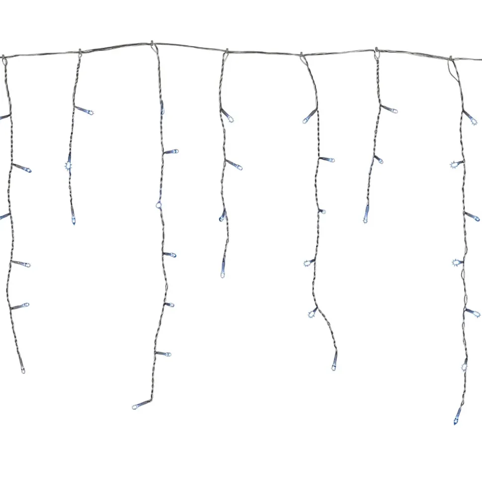 Guirlande glacon solaire bleu, 70 LED Caracteristiques : IP44/31V 8 fonctions avec memoire Dimension: Longueur 2m x 0.5 m (retombe) Couleur du fil : transparent Composition: Plastique & Métal