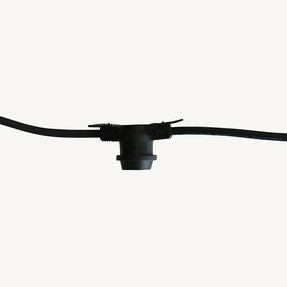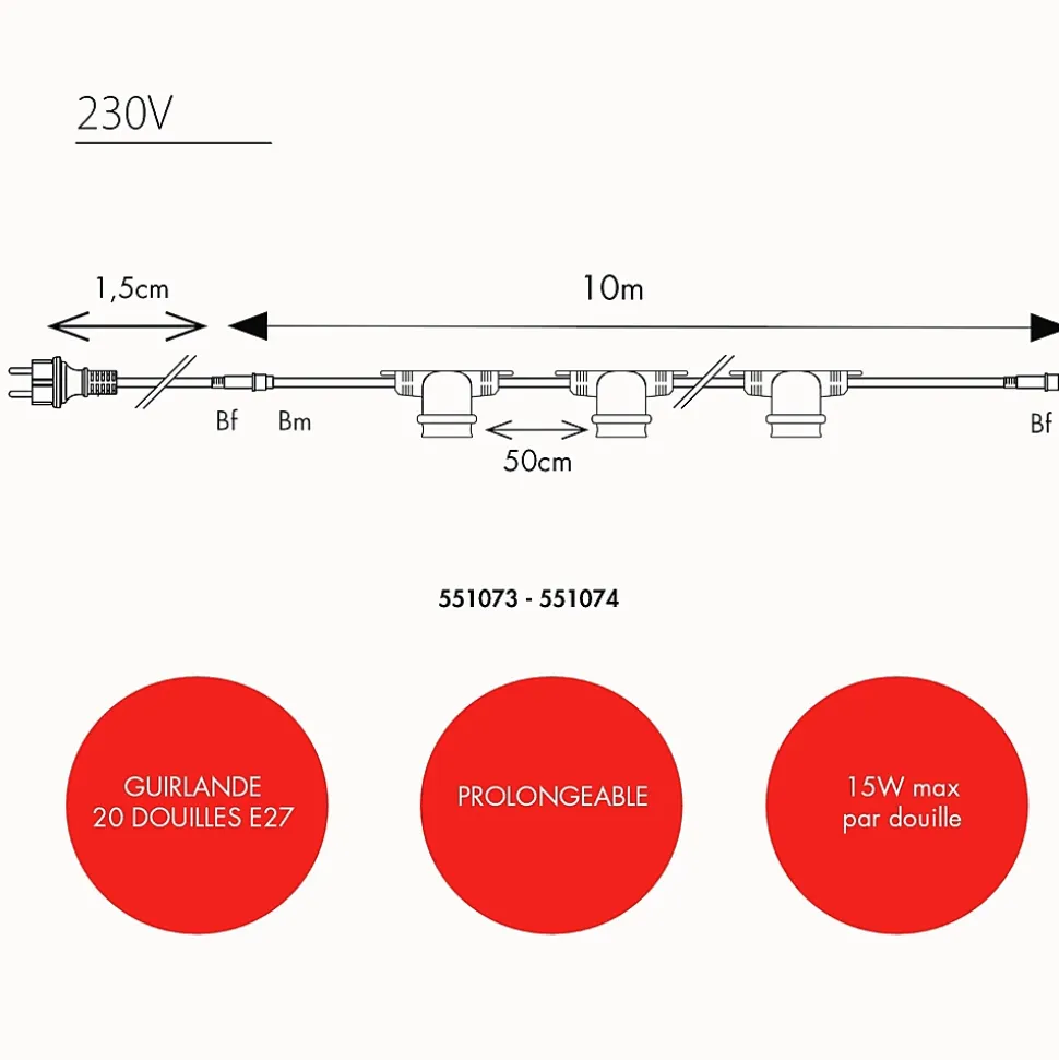 Apportez une touche festive à vos extérieurs grâce à cette authentique guirlande guinguette. Prolongeable jusqu’à 100m, elle vous permettra de créer un plafond ou de redessiner une pergola comme un vrai décorateur. Qualité professionnelle ! Ajoutez les ampoules de votre choix• Type de douilles : E27• Nb de douilles : 20 douilles E27 de 15W max• Dimensions : L10m• Prolongeable : jusqu’à 100m• Usage : Intérieur/Extérieur• Indice de protection: IP44• Alimentation : Sur secteur, inclue• Puissance : 15W max par douille• Tension : 230V• Couleur du câble : câble noir• Matière : Caoutchouc• Qualité professionnelle• Garantie : 2 ansUsage et installation : Son indice IP 44 vous garantit une utilisation extérieure quelque soit la météo tout au long de l’année. Elle peut servir de décoration sur une terrasse, votre balcon ou bien dans un bar, un restaurant, un camping. Chaque douille est équipée de 4 anneaux de fixation afin de faciliter son installation.Données techniques : La guirlande mesure 10m de longeur. Elle contient 20 douilles E27. Chaque douille est équipée d’un joint d’étanchéité. les guirlandes sont vendues sans ampoule. Elles supportent 15W maximum par douille. Il y a 4 anneaux de fixations sur chaque douille. Les guirlandes sont prolongeables jusqu’à 100m.Source lumineuse : Le guirlande est composée 20 douilles E27. Les ampoules ne sont pas inclues;