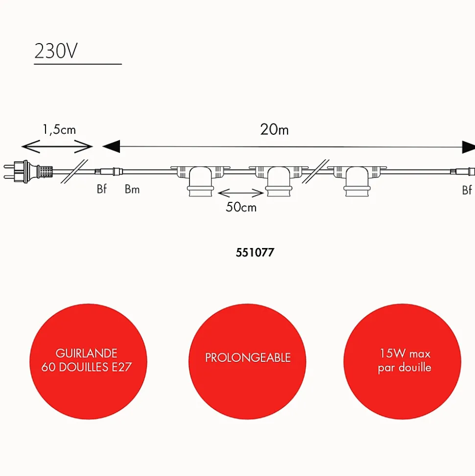 Apportez une touche festive à vos extérieurs grâce à cette authentique guirlande guinguette. Prolongeable jusqu’à 100m, elle vous permettra de créer un plafond ou de redessiner une pergola comme un vrai décorateur. Qualité professionnelle ! Ajoutez les ampoules de votre choix• Type de douilles : E27• Nb de douilles : 60 douilles E27 de 15W max• Dimensions : L20m• Prolongeable : jusqu’à 100m• Usage : Intérieur/Extérieur• Indice de protection: IP44• Alimentation : Sur secteur, inclue• Puissance : 15W max par douille• Tension : 230V• Couleur du câble : câble blanc• Matière : Caoutchouc• Qualité professionnelle• Garantie : 2 ansUsage et installation : Son indice IP 44 vous garantit une utilisation extérieure quelque soit la météo tout au long de l’année. Elle peut servir de décoration sur une terrasse, votre balcon ou bien dans un bar, un restaurant, un camping. Chaque douille est équipée de 4 anneaux de fixation afin de faciliter son installation.Données techniques : La guirlande mesure 20m de longeur. Elle contient 60 douilles E27. Chaque douille est équipée d’un joint d’étanchéité. les guirlandes sont vendues sans ampoule. Elles supportent 15W maximum par douille. Il y a 4 anneaux de fixations sur chaque douille. Les guirlandes sont prolongeables jusqu’à 100m.Source lumineuse : Le guirlande est composée 60 douilles E27. Les ampoules ne sont pas inclues.
