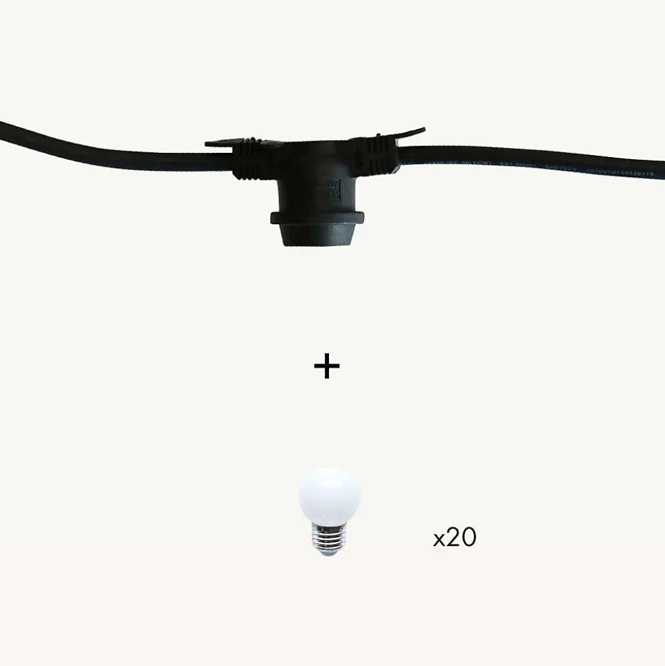 Créez une ambiance digne des bals Ménilmontant et apportez une touche festive à vos extérieurs avec ce kit de guirlande guinguette composé d’une guirlande câble noir de 10m, 20 douilles et de 20 ampoules E27 blanc chaud ! Indémodable ! Qualité professionnelle!• Type de douille : E27• Nb d’ampoules : 20 ampoules forme G45• Couleur de LED : Blanc chaud à filament• Dimensions : L10m• Couleur du câble : Noir• Prolongeable : jusqu’à 100m• Usage : Intérieur/Extérieur IP44• Alimentation : Sur secteur, inclue• Puissance : 10W• Tension : 230V• Matière : Caoutchouc• Qualité professionnelle• Garantie : 2 ansUsage & installation :Son indice IP44 vous garantit une utilisation extérieure quelque soit la météo tout au long de l’année. Créez un plafond ou redessinez une pergola comme un vrai décorateur. Elle peut servir de décoration sur une terrasse, votre balcon ou bien dans un bar, un restaurant ou un camping.Données techniques & dimensions :Ce kit est composé de la guirlande guinguette Festival 551073 et de 4 lots d’ampoules 550190 soit 20 ampoules blanc chaud douille E27 forme G45. C’est à vous d’assembler les ampoules. Sa puissance est de 10W. La guirlande mesure 10m, elle est prolongeable jusqu’à 100m. Elle est vendue avec des ampoules. Son câble est noir. Chaque douille est équipée d’un joint d’étanchéité et supporte 15W.Source lumineuse :Chaque douille supporte 15W max. L’ampoule E27 est fabriquée en polycarbonate, elle est donc incassable. Les LED sont à faible consommation d’énergie. Les ampoules haute luminosité vous garantissent un éclairage optimal pour vos soirées d’été.