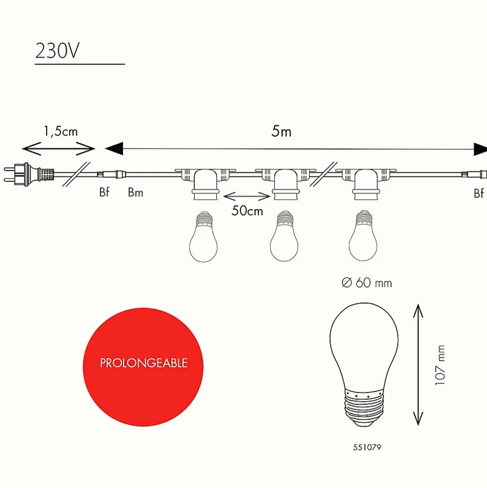 Créez une ambiance digne des bals Ménilmontant et apportez une touche festive à vos extérieurs avec ce kit de guirlande guinguette composé d’une guirlande câble blanc de 5m, 10 douilles et de 10 ampoules E27 Jaune, rouge, orange, violet et rose ! Indémodable ! Qualité professionnelle!• Type de douille : E27• Nb d’ampoules : 10 ampoules forme A60• Couleur de LED : Couleurs chaudes : Jaune, rouge, orange, violet et rose• Dimensions : L5m• Couleur du câble : Blanc• Prolongeable : jusqu’à 100m• Usage : Intérieur/Extérieur IP44• Alimentation : Sur secteur, inclue• Puissance : 25W• Tension : 230V• Matière : Caoutchouc• Qualité professionnelle• Garantie : 2 ansUsage & installation : Son indice IP44 vous garantit une utilisation extérieure quelque soit la météo tout au long de l’année. Créez un plafond ou redessinez une pergola comme un vrai décorateur. Elle peut servir de décoration sur une terrasse, votre balcon ou bien dans un bar, un restaurant ou un camping.Données techniques & dimensions : Ce kit est composé de la guirlande guinguette Festival 551072 et de 2 lot d’ampoules 551079 soit 2 ampoules jaunes, 2 oranges, 2 rouges, 2 violettes et 2 roses, douille E27 forme A60. C’est à vous d’assembler les ampoules. Sa puissance est de 25W. La guirlande mesure 5m, elle est prolongeable jusqu’à 100m. Elle est vendue avec des ampoules. son câble est blanc. Chaque douille est équipée d’un joint d’étanchéité et supporte 15W.Source lumineuse :Chaque douille supporte 15W max. L’ampoule E27 est fabriquée en polycarbonate, elle est donc incassable. Les LED sont à faible consommation d’énergie. Les ampoules haute luminosité vous garantissent un éclairage optimal pour vos soirées d’été.