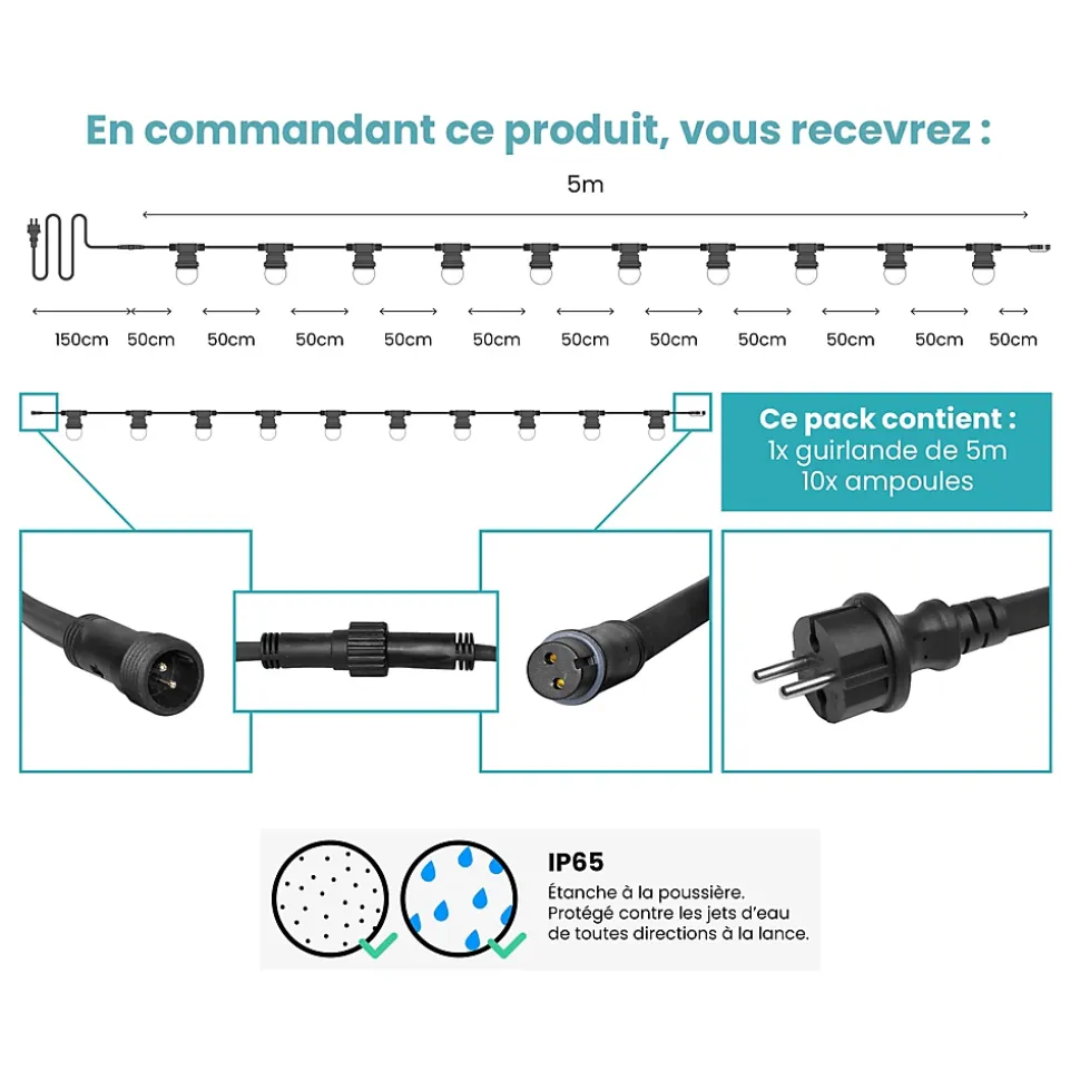 - ETANCHE IP65: Notre guirlande est étanche et répond aux normes IP65 ! Elle résiste à l’eau et à la poussière. Votre guirlande peut passer l’hiver dehors sans aucuns soucis !