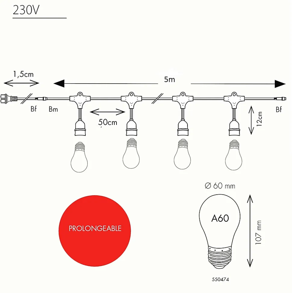 Créez une ambiance digne des bals Ménilmontant et apportez une touche festive à vos extérieurs avec ce kit de guirlande guinguette composé d’une guirlande Java de 5m, 10 douilles et de 10 ampoules E27 blanc chaud ! Indémodable ! Qualité professionnelle !• Type de douilles : E27• Nb d’ampoules : 10 ampoules forme A60• Couleur LED : Blanc chaud• Dimensions : L5m• Couleur du câble : Blanc• Prolongeable : jusqu’à 100m• Usage : Intérieur/Extérieur IP44• Alimentation : Sur secteur, inclue• Puissance : 25W• Tension : 230V• Matière : Caoutchouc• Qualité professionnelle• Garantie : 2 ansUsage & installation : Son indice IP44 vous garantit une utilisation extérieure quelque soit la météo tout au long de l’année. Créez un plafond ou redessinez une pergola comme un vrai décorateur. Elle peut servir de décoration sur une terrasse, votre balcon ou bien dans un bar, un restaurant ou un camping.Données techniques & dimensions : Ce kit est composé de la guirlande 551070 et 10 ampoules 550474 blanc chaud douille E27 forme A60. C’est à vous d’assembler les ampoules. Sa puissance est de 25W. La guirlande mesure 5m, elle est prolongeable jusqu’à 100m. Elle est vendue avec des ampoules. Son câble est blanc. Chaque douille est équipée d’un joint d’étanchéité et supporte 15W.Source lumineuse :Chaque douille supporte 15W max. L’ampoule E27 est fabriquée en polycarbonate, elle est donc incassable. Les LED sont à faible consommation d’énergie. Les ampoules haute luminosité vous garanitssent un éclairage optimal pour vos soirées d’été.