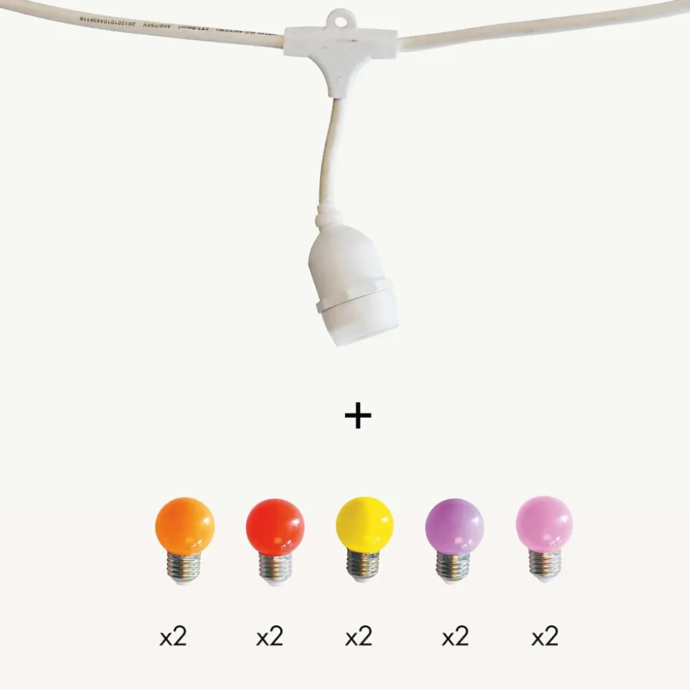 Créez une ambiance digne des bals Ménilmontant et apportez une touche festive à vos extérieurs avec ce kit de guirlande guinguette composé d’une guirlande Java de 5m, 10 douilles et de 10 ampoules E27 Jaune, rouge, orange, violet et rose! Indémodable ! Qualité professionnelle !• Type de douilles : E27• Nb d’ampoules : 10 ampoules forme G45• Couleur LED : Couleurs chaudes : Jaune, rouge, orange, violet et rose• Dimensions : L5m• Couleur du câble : Blanc• Prolongeable : jusqu’à 100m• Usage : Intérieur/Extérieur IP44• Alimentation : Sur secteur, inclue• Puissance : 13W• Tension : 230V• Matière : Caoutchouc• Qualité professionnelle• Garantie : 2 ansUsage & installation : Son indice IP44 vous garantit une utilisation extérieure quelque soit la météo tout au long de l’année. Créez un plafond ou redessinez une pergola comme un vrai décorateur. Elle peut servir de décoration sur une terrasse, votre balcon ou bien dans un bar, un restaurant ou un camping.Données techniques & dimensions : Ce kit est composé de la guirlande 551070 et de 2 lots d’ampoules 551080 soit 2 ampoules jaunes, 2 oranges, 2 rouges, 2 violettes et 2 roses, douille E27 forme G45. C’est à vous d’assembler les ampoules. Sa puissance est de 13W. La guirlande mesure 5m, elle est prolongeable jusqu’à 100m. Elle est vendue avec des ampoules. Son câble est blanc. Chaque douille est équipée d’un joint d’étanchéité et supporte 15W.Source lumineuse :Chaque douille supporte 15W max. L’ampoule E27 est fabriquée en polycarbonate, elle est donc incassable. Les LED sont à faible consommation d’énergie. Les ampoules hautes luminosité vous garantissent un éclairage optimal pour vos soirées d’été.