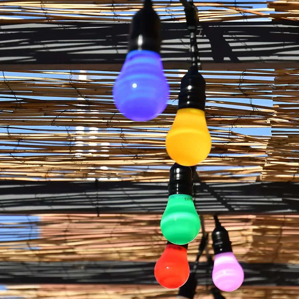 Créez une ambiance digne des bals Ménilmontant et apportez une touche festive à vos extérieurs avec l’authentique guirlande guinguette ! Indémodable ! Qualité professionnelle !• Nb d’ampoules : 10 ampoules LED, forme A60• Culot : E27• Dimensions : L5 m• Prolongeable : jusqu’à 100m• Usage : Intérieur/Extérieur IP44• Alimentation : Filaire• Puissance : 25W• Tension : 230V• Couleur du câble : noir• Matière : Caoutchouc• Qualité professionnelle• Garantie : 2 ansUsage et installation : Son indice IP 44 vous garantit une utilisation extérieure quelque soit la météo tout au long de l’année. Créez un plafond ou redessinez une pergola comme un vrai décorateur. Elle peut servir de décoration sur une terrasse, votre balcon ou bien dans un bar, un restaurant ou un camping.Données techniques et dimensions : Ce pack comprend une guirlande guinguette de 5m et 10 ampoules multicouleurs de 2,5W : 2 x ampoules vertes, 2 x ampoules bleues, 2 x ampoules rouges, 2 x ampoules jaunes et 2 x ampoules roses. La guirlande est polongeable jusqu’à 100m. Aucun cordon de prolongement n’est à rajouter, son câble est équipé d’une connectique de prolongement.Source lumineuse : Les ampoules sont interchangeables et remplaçables. Ampoule haute luminosité, qui vous garantit un éclairage optimal pour vos soirées d’été. Chaque douille est équipée d’un anneau de fixation afin de faciliter son installation.Option : Cette guirlande existe également en blanc chaud et blanc froid.