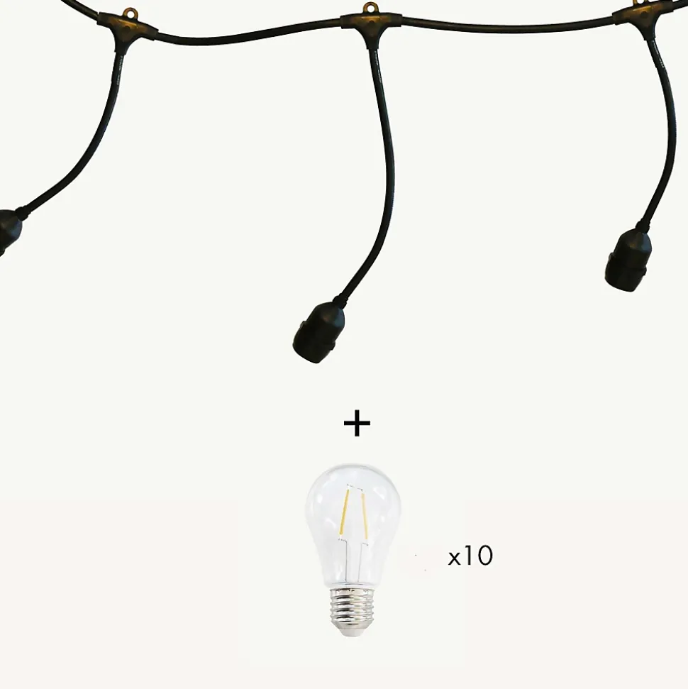 Créez une ambiance digne des bals Ménilmontant et apportez une touche festive à vos extérieurs avec ce kit de guirlande guinguette composé d’une guirlande 5m 10 douilles et de 10 ampoules E27 blanc chaud à filament ! Indémodable ! Qualité professionnelle !• Type de douilles : E27• Nb d’ampoules : 10 ampoules forme A60• Couleur LED : Blanc chaud à filament• Dimensions : L5m• Prolongeable : jusqu’à 100m• Luminosité : 660 lumens• Usage : Intérieur/Extérieur• Indice de protection: IP44• Alimentation : Sur secteur, inclue• Puissance : 20W• Tension : 230V• Couleur du câble : noir• Matière : Caoutchouc• Qualité professionnelle• Garantie : 2 ansUsage & installation : Son indice IP44 vous garantit une utilisation extérieure quelque soit la météo tout au long de l’année. Créez un plafond ou redessinez une pergola comme un vrai décorateur. Elle peut servir de décoration sur une terrasse, votre balcon ou bien dans un bar, un restaurant ou un camping.Données techniques & dimensions : Ce kit est composé de la guirlande 551075 et de 2 lot d’ampoules 551078 soit 10 blanc chaud à filaments douille E27 forme A60. C’est à vous d’assembler les ampoules. Sa puissance est de 20W. La guirlande mesure 5m, elle est prolongeable jusqu’à 100m. Elle est vendue avec des ampoules. son câble est noir. Chaque douille est équipée d’un joint d’étanchéité et supporte 15W. Il y a 3 mesures de descentes différentes et chaque descente contient un anneau de fixation.Source lumineuse :Chaque douille supporte 15W max. L’ampoule E27 est fabriquée en polycarbonate, elle est donc incassable. Les LED sont à faible consommation d’énergie. Les ampoules haute luminosité vous garanitssent un éclairage optimal pour vos soirées d’été. Sa luminosité est de 660 lumens.