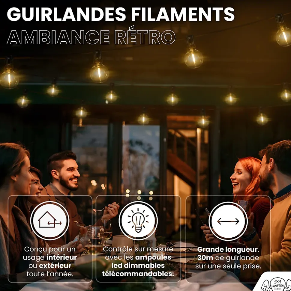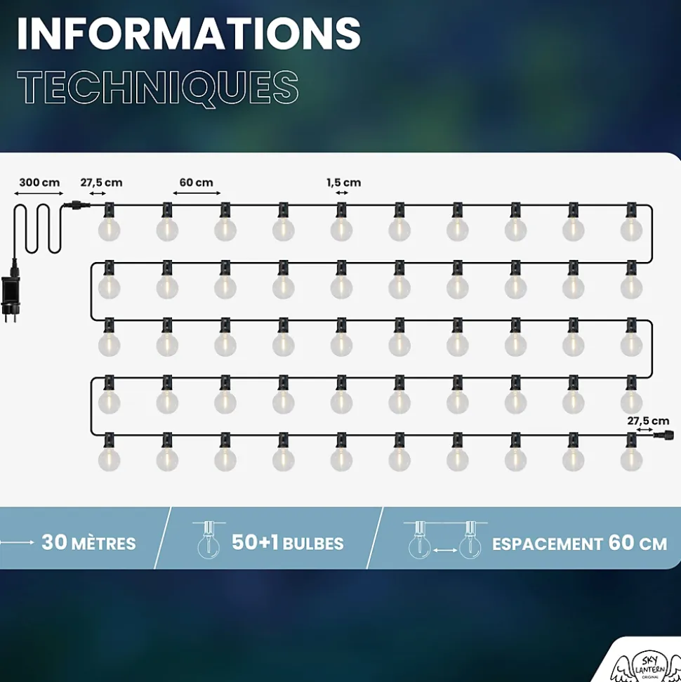 La guirlande guinguette LED idéale pour illuminer vos grands espacesDécouvrez la Guirlande Guinguette LED 30M avec 50 ampoules dimmables, parfaite pour créer une ambiance chaleureuse et festive dans vos espaces extérieurs ou intérieurs. Conçue par SkyLantern, expert en décoration lumineuse, cette guirlande est spécialement pensée pour illuminer de vastes surfaces telles que terrasses, jardins ou même pour des événements comme mariages ou anniversaires.Avec ses 3M de câble au départ et sa longueur exceptionnelle de 30 mètres, cette guirlande est équipée de 50 ampoules LED rondes à filament, offrant une lumière blanche chaude et douce. Grâce à sa certification IP44, elle est adaptée à une utilisation extérieure tout au long de l’année, résistant efficacement à l’eau et aux intempéries. L’intensité lumineuse est facilement ajustable via la télécommande incluse, pour moduler l’ambiance selon vos envies : tamisée pour des moments intimes ou plus éclatante pour des occasions festives.Caractéristiques principales : Longueur totale : 30 mètres + 3 mètres de câble Nombre d’ampoules : 50 ampoules LED dimmables Usage : Extérieur et intérieur, certification IP44 Contrôle à distance : Télécommande pour allumer, éteindre et ajuster l’intensité Installation facile : Aucun accessoire supplémentaire nécessaire Esthétique élégante et rétro-moderneCette guirlande est l’élément indispensable pour transformer vos espaces en lieux enchanteurs. Que ce soit accrochée à un arbre, sous un chapiteau ou suspendue sur une terrasse, elle apporte une touche d’élégance intemporelle et une lumière magique à chaque occasion.