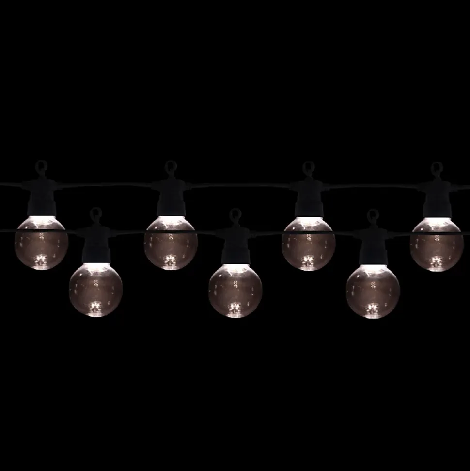 Notre Guirlande Guinguette LED Blanche de 8m possède 10 ampoules LED de couleur d’éclairage blanc chaud ou blanc froid (selon votre choix). Étanche, elle est idéale pour une décoration d’extérieur avec sa certification IP65.Bar, terrasse, pergola, façade, intérieur, cette Guirlande Guinguette peut être utilisée dans de nombreuses circonstances. Idéale pour créer une belle décoration et un éclairage d’ambiance, nous vous la conseillons vivement pour sublimer votre lieu.Aussi disponible avec différentes longueurs, nombre d’ampoules, couleur de câble ainsi que couleur d’ampoule. Pour découvrir l’ensemble de la gamme, vous pouvez consulter la catégorie Guirlande Guinguette LED. ATTENTION: Les ampoules sont des LED intégrées, elles ne sont pas remplaçables. Veiller à bien isoler la prise électrique, toute mauvaise manipulation ou utilisation ne sera pas prise en garanti.