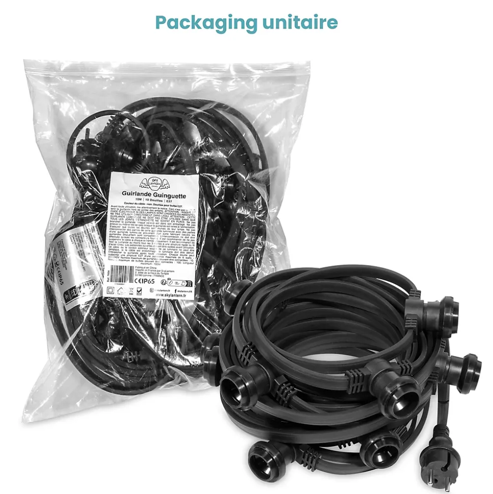 Une Guirlande qui résiste à tous les tempsAttention; cette guirlande n’est compatible qu’avec des ampoules E27 LED de 15W maximum. Les ampoules LED SkyLantern ci-dessous sont parfaitement adaptées à ce modèle.Guirlande d’extérieur de type Guinguette de 10 mètres de long comprenant 10 douilles de type E27 (à vis). La guirlande est livrée sans les ampoules; à rajouter dans votre panier selon vos envies. Cette guirlande dispose d’une norme de protection IP65 qui lui permet de résister à toutes les intempéries.Ce modèle de guirlande guinguette dispose d’un bloc d’extension permettant de mettre jusqu’à 10 guirlandes en série pour atteindre 100 Mètres de longueur. Le câble est renforcé pour une utilisation en intérieur comme en extérieur. Chaque connecteur E27 dispose d’une protection étanche aux normes IP 65.Cette guirlande peut être utilisée avec des ampoules dimmables couplées avec un variateur d’intensité pour régler la puissance de la lumière et rendre la guirlande télécommandable. Vous pouvez compléter cette guirlande par nos ampoules LED spéciales guinguette de type E27 présentés en bas de page. De fait; ces ampoules sont remplaçables à tout moment.Jouez avec les couleurs pour créer la plus belle des ambiances guinguette pour votre événement !SkyLantern est LE spécialiste en France de la guirlande guinguette mariage depuis plus de 10 ans. Nos guirlandes guinguettes sont utilisées dans de nombreux mariages; fêtes; restaurants; fêtes nationales en France et en Europe.Elles sont toutes garanties 2 ans.