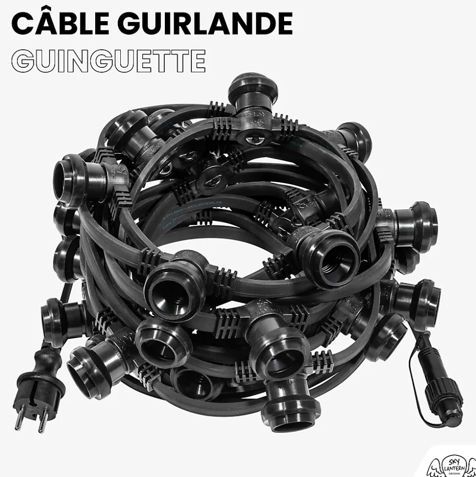 Une Guirlande qui résiste à tous les temps Attention; cette guirlande n’est compatible qu’avec des ampoules E27 LED de 15W maximumLes ampoules LED SkyLantern ci-dessous sont parfaitement adaptées à ce modèleGuirlande d’extérieur de type Guinguette de 30 mètres de long comprenant 90 douilles de type E27 (à vis)La guirlande est livrée sans les ampoules; à rajouter dans votre panier selon vos enviesCette guirlande dispose d’une norme de protection IP65 qui lui permet de résister à toutes les intempériesCe modèle de guirlande guinguette dispose d’un bloc d’extension permettant de mettre jusqu’à 5 guirlandes en série pour atteindre 50 Mètres de longueurLe câble est renforcé pour une utilisation en intérieur comme en extérieurChaque connecteur E27 dispose d’une protection étanche aux normes IP 65Vous pouvez compléter cette guirlande par nos ampoules LED spéciales guinguette de type E27 présentés en bas de pageDe fait; ces ampoules sont remplaçables à tout momentJouez avec les couleurs pour créer la plus belle des ambiances guinguette pour votre événement ! SkyLantern est LE spécialiste en France de la guirlande guinguette mariage depuis plus de 10 ansNos guirlandes guinguettes sont utilisées dans de nombreux mariages; fêtes; restaurants; fêtes nationales en France et en EuropeElles sont toutes garanties 2 ans.