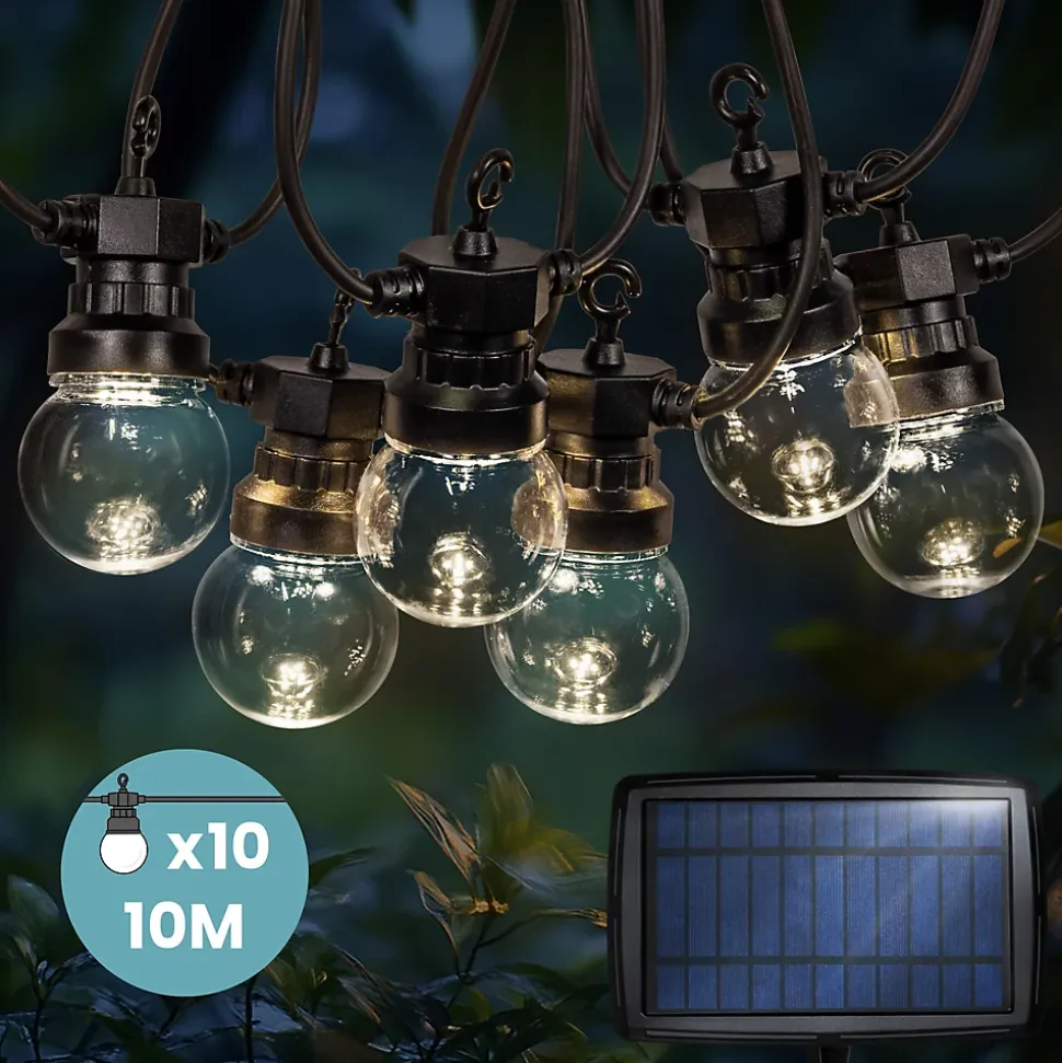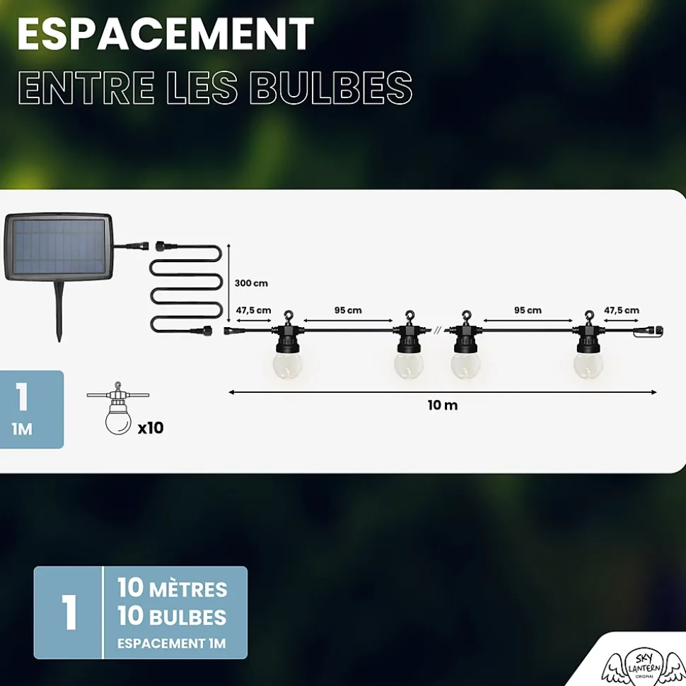 - GRANDE LONGUEUR – Cette guirlande lumineuse extérieure solaire de SkyLantern, avec ses 10 bulbes transparents de 5 LEDs, offre une lumière douce et chaleureuse. Parfaite pour illuminer votre jardin, terrasse ou tout autre espace extérieur. Grâce à sa technologie LED solaire, elle ne vous coûte rien à l’usage. Profitez d’une lumière toute la nuit, sans vous soucier de la consommation d’énergie. Couplée avec une deuxième guirlande led 10m elle formera une guirlande solaire exterieur 20m