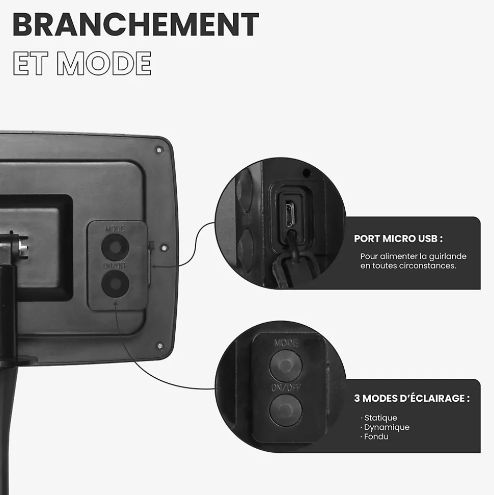 - 3 MODES D’ÉCLAIRAGE – Notre Guirlande Lumineuse Exterieur Solaire offre trois modes d’éclairage pour s’adapter à toutes vos occasions. Que vous souhaitiez une lumière statique pour une ambiance douce et apaisante, un mode fade pour une transition en douceur entre les différentes lumières ou un mode dynamique pour une atmosphère festive et animée, nos guirlandes lumineuses extérieur répondront à vos besoins. Idéale pour illuminer votre jardin, votre terrasse ou tout autre espace extérieur.