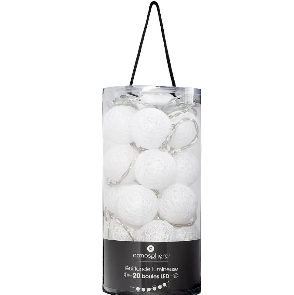 Pour un éclairage discret et original, optez pour la guirlande LED blanche Atmosphera.Sobre et moderne Cette guirlande compte 20 boules reliées entre elles contenant chacune une ampoule LED. Votre guirlande diffusera une lumière plus ou moins teintée mais toujours tamisée. Cet accessoire lumineux se branche sur secteur. Accrochez votre guirlande au-dessus de la tête d’un lit Atmosphera pour créer une ambiance cosy dans votre chambre.Le petit plus déco Donnez un esprit guinguette à votre salon en décorant votre bar avec plusieurs guirlandes à LED.