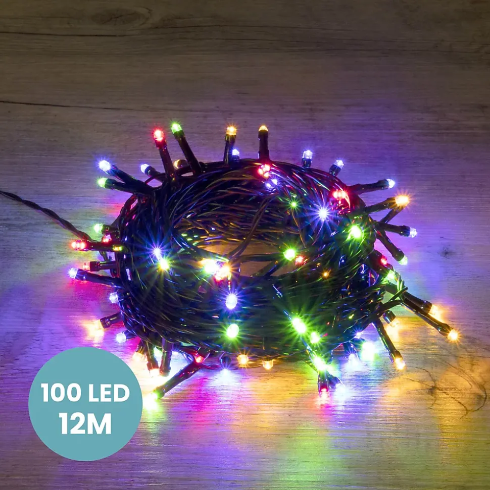 Le must-have de vos évènements festifs Ajoutez une touche magique à vos soirées, mariages ou fêtes avec notre guirlande lumineuse LED. Créez un ciel étoilé au-dessus de vos tables ou décorez votre sapin à Noël pour une ambiance chaleureuse et féérique. Polyvalente, elle s’adapte à toutes les occasions, en intérieur comme en extérieur. Disponible en blanc froid, blanc chaud ou multicolore, elle répond à toutes vos envies. Besoin d’aide pour choisir la guirlande idéale ? Consultez notre guide. Avec ses 8 modes d’éclairage (Combinaison, En vague, Séquentiel, Slo-glo, Variable, Lente, Flash, Continu), elle s’adapte à chaque ambiance. Le minuteur intégré et la télécommande incluse simplifient son utilisation. Caractéristiques générales : 8 modes lumineux Minuteur programmable Raccordable jusqu’à 600 LEDs / 66M Télécommande & pile CR2025 incluses Étanche (IP44) & sans danger Caractéristiques techniques : 100 LEDs – Longueur : 12 m Couleur : Multicolore – Câble : Noir Espacement LEDs : 10 cm Distance transfo–LED : 2 m Tension : 31 V – Puissance : 3,6 W Contenu du colis : 1x guirlande LED 12 m
