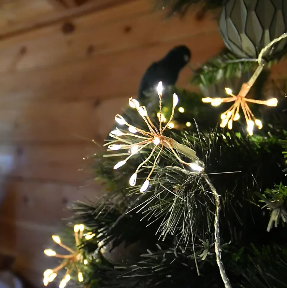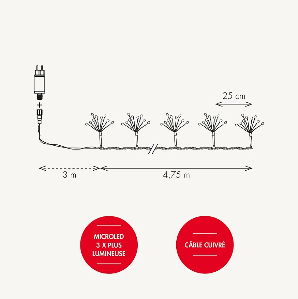 Idéale en DIY autour d’un cadre, d’une échelle ou encore dans un vase, laissez parler votre créativité ! Sa grande longueur et sa luminosité réveilleront vos soirées.• Nb de LED : 300 – 20 bouquets de 15 microLED• Couleur de LED : Blanc chaud• Animation : Fixe• Dimensions : 4.75m• Luminosité : 100 lumens• Puissance : 6W• Tension : 230V• Alimentation : sur secteur• Couleur du câble : cuivré• Matière : Produit en PVC souple câble sécurisé par un revêtement• Prolongeable : non• Usage : Intérieur/Extérieur• Indice de protection : IP44• Garantie : 2 ansUsage & installation :Cette jolie guirlande trouvera sa place partout. Son câble discret et ses mircoLED habilleront murs, ciel de lit, vases, arbres. Décorez avec finesse et élégance.Données techniques & dimensions :Dotée de l’indice de protection IP44, votre guirlande résistera à toutes les météos. Simple d’utilisation, il vous suffit de brancher à une prise secteur grâce au câble de 3m inclus.Source lumineuse :Cette guirlande est composée de 20 bouquets de 15 microLED soit 300 MicroLED blanc chaud fixe. La MicroLED nouvelle génération est trois fois plus lumineuse qu’une LED classique