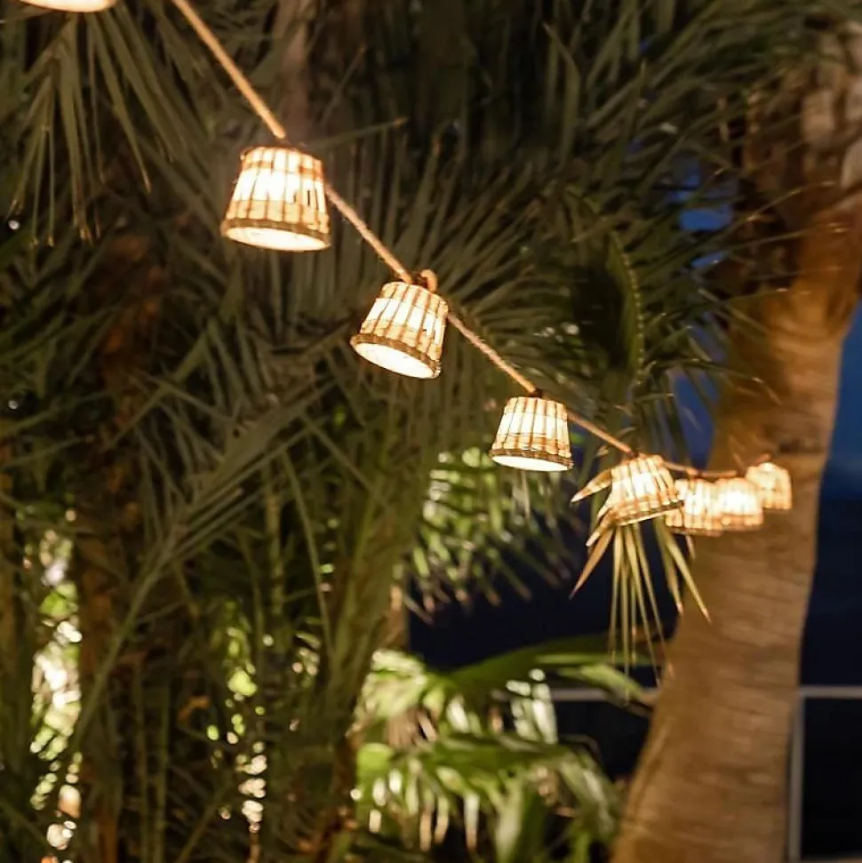 Les caractéristiques techniquesCette guirlande lumineuse étanche peut être installée aussi bien à l’intérieur qu’en extérieur grâce à son indice de protection (IP) 44 qui en garantit l’étanchéité. La guirlande est aussi résistante au vent et au soleil.Cette guirlande mesure 8 mètres et est équipée de 10 ampoules transparentes.Vous pouvez relier plusieurs guirlandes à la suite (maximum 4) grâce aux connections livrées avec.Les avantages esthétiques Donnez un air de fête à vos extérieurs avec cette guirlande lumineuse.Elle est composée d’un cordon en jute et de 10 ampoules transparentes dans un abat-jour en bambou et rotin tressé main du plus bel effet qui donnera à votre éclairage un aspect naturel.Elle égaiera aussi bien vos fêtes estivales dans une ambiance guinguette que votre buffet de mariage en belle saison.En hiver, elle contribuera à la magie des fêtes de fin d’année en parant votre façade ou vos arbres de jolies lumières.Elle existe également en version solaire (ref LUMAUR800XXSLNW)