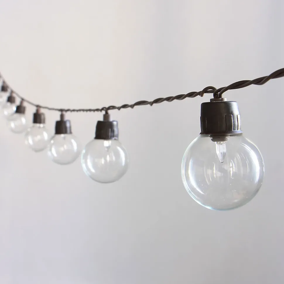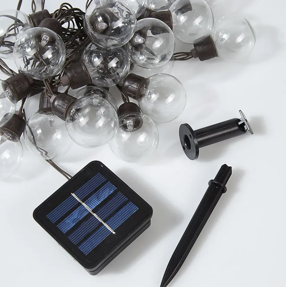Guirlande lumineuse solaire 20 ampoules rondesGuirlande extérieur décorative, elle dispose de capteurs qui transforment le rayonnement solaire en énergie électrique. Composée de 20 ampoules rondes elle est idéale pour votre décoration d’intérieur comme d’extérieur. Ses ampoules transparentes vous assurent un éclairage blanc chaud qui ne manquera pas de vous procurer une ambiance chaleureuse.Elle peut être utilisée en mode continu ou en mode clignotant et se recharge avec l’énergie du soleil dans la journée pour s’allumer automatiquement dès la nuit tombée. Lorsque le panneau solaire est correctement placé et que la journée est suffisamment ensolleillée, l’éclairage dure toute la nuit.Cette guirlande présente également l’avantage de disposer d’un panneau solaire déporté, plus pratique et plus discret. L’installation quant à elle est très facile et très rapide puisqu’il n’y a aucun fils, ni aucun branchements à effectuer. Caractéristiques techniques :Guirlande comportant 20 ampoules rondes vissées.Dimensions d’une ampoule : L 6 x Diamètre 4 cm.Matière : verre.Taille du câble entre le panneau solaire et le premier élément lumineux : 1,8m.Espacement entre les éléments lumineux : 20 cm.Taille du cordon comportant des lumières : 3,8 m.Ampoule transparente blanc chaud G40.Indice de protection : IP44.2 fonctions : fixe ou clignotant.Recharge automatique par panneau solaire.Batterie intégrée type Ni-MHAA 800 mAh.Allumage automatique à la tombée de la nuit.