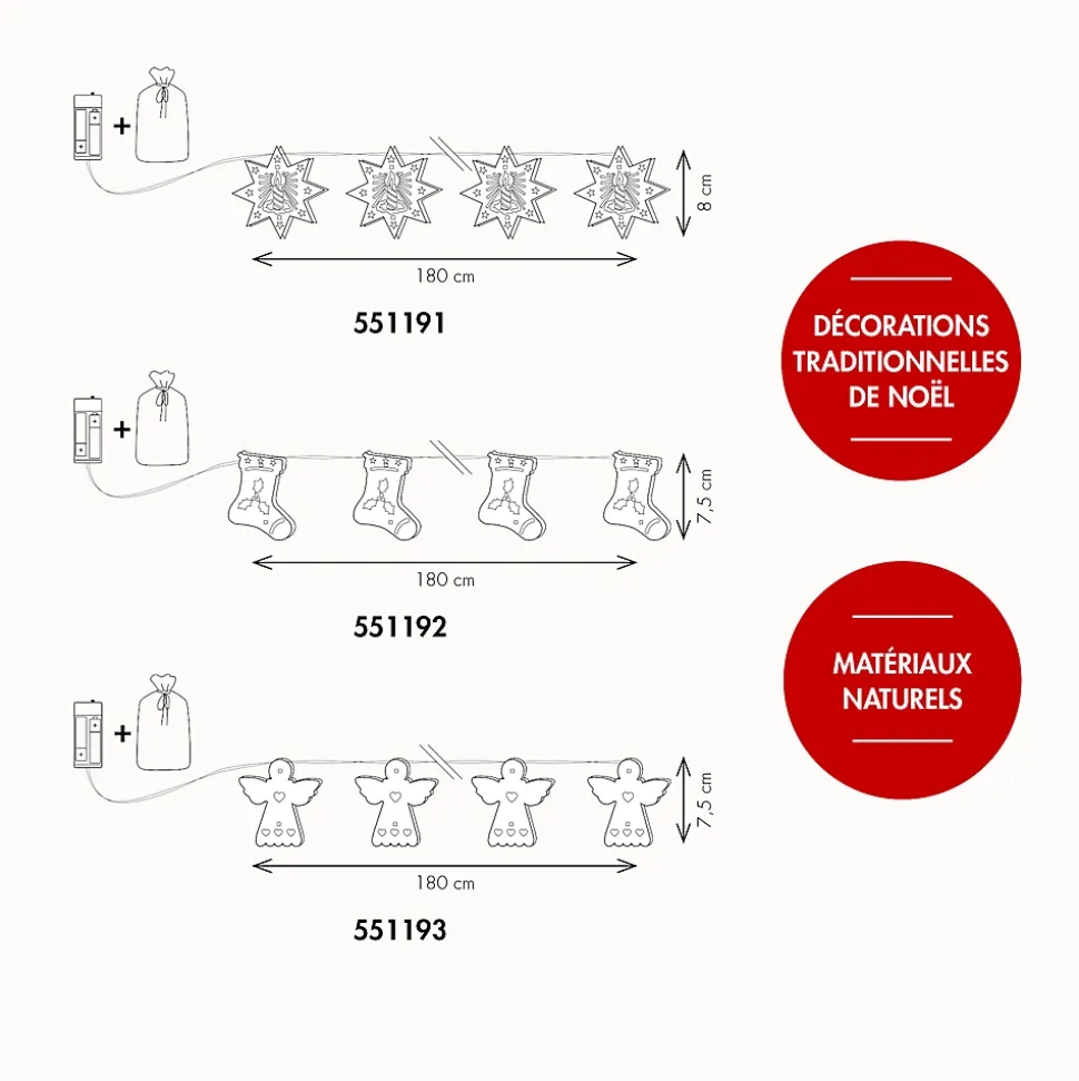 Cette guirlande en bois illumine votre tête de lit ou décore vos meubles. Elle vous apportera une lumière chaleureuse. L’effet 3D du bois apportera un effet cosy à votre ambiance.• Couleur LED : Blanc chaud• Dimensions : L1,8m• Nb de LED : 10 LED• Animation : Fixe• Luminosité : 50 lumens• Alimentation : 2 piles AA 1,5V Alkaline (non incluses)• Couleur du câble : transparent• Matière : Produit en PVC souple et bois• Usage : Intérieur• Garantie : 2 ansUsage & installation :Simple d’utilisation, fonctionnement avec un boîter on/off/timer. La guirlande est livrée avec un pochon en toile de jute pour cacher le boîtier piles. Le mode Timer vous permet d’actionner un minuteur à votre guirlande : Allumage pendant 6 heures (tous les jours à la même heure) à l’arrêt pendant 18 heures. Utilisation intérieure exclusivement.Données techniques & dimensions :La guirlande mesure 1,80m. La couleur du câble est transparente.Source lumineuse :Chaque guirlande comporte 10 LED blanc chaud fixe.