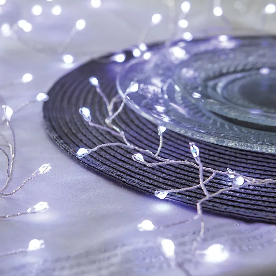 Idéale en DIY autour d’un cadre, d’une échelle ou encore dans un vase, laissez parler votre créativité ! Sa grande longueur et sa luminosité réveilleront vos soirées.• Couleur de la lumière : blanc froid• Nombre de LED : 240• Luminosité : 240 lumens• Dimensions : L:6m, 40 LED au mètre• Puissance : transformateur 230 V/12V• Alimentation : Filaire• Couleur du câble : argent• Matière : Produit en PVC souple câble sécurisé par un revêtement.• Connectable : non• Garantie : 2 ans Usage et installation : Cette jolie guirlande trouvera sa place partout. Son câble discret et ses mircoLED habilleront murs, ciel de lit, vases, arbres. Décorez avec finesse et élégance. Données techniques et dimensions : Dotée de l’indice de protection IP44, votre guirlande résistera à toutes les météos. Simple d’utilisation, il vous suffit de la brancher à une prise secteur. Source lumineuse : Cette guirlande est composée de 40 LED au mètre. La MicroLED nouvelle génération est trois fois plus lumineuse qu’une LED classique.Option: Cette guirlande existe en 3m et 6m, et se décline en blanc chaud et multicolore.