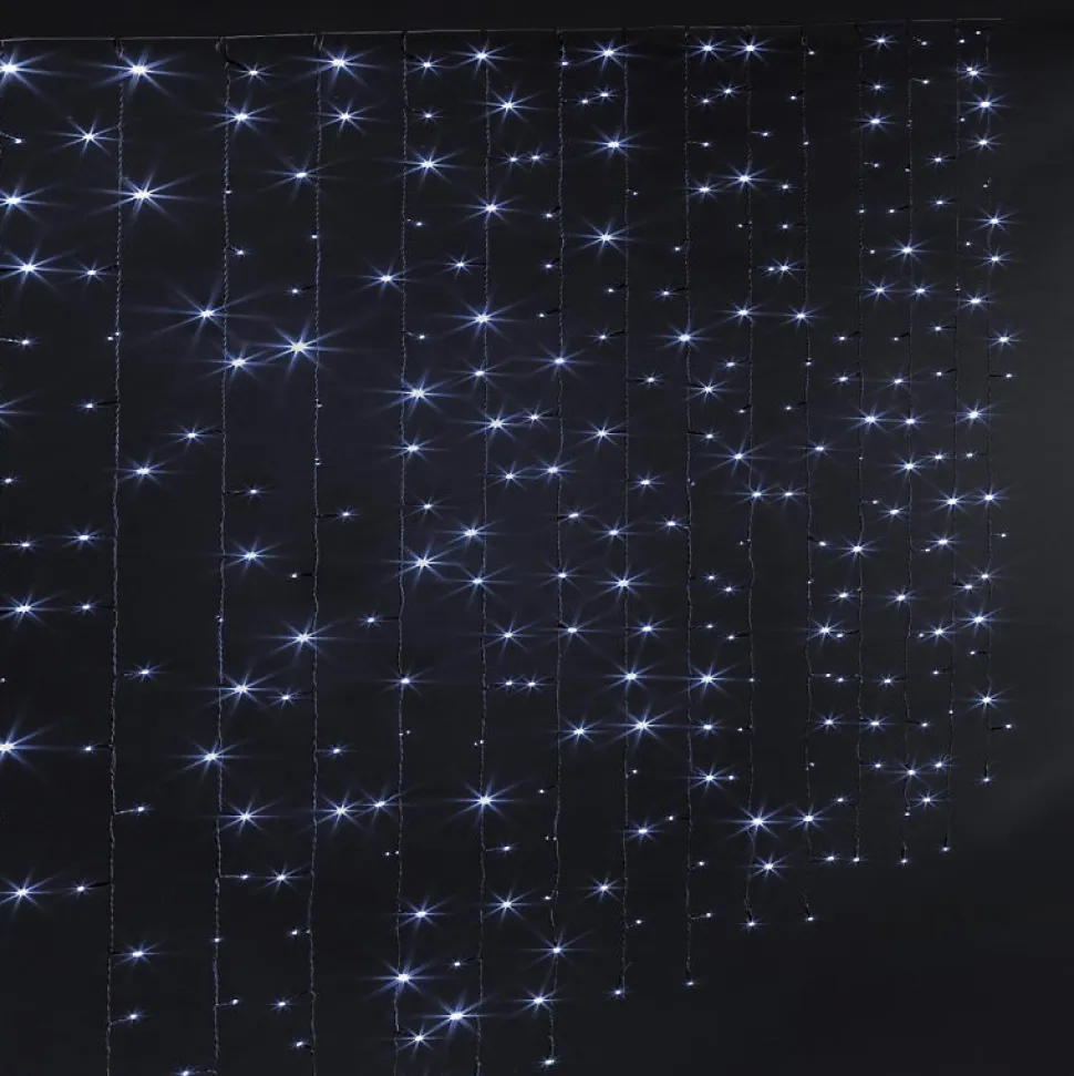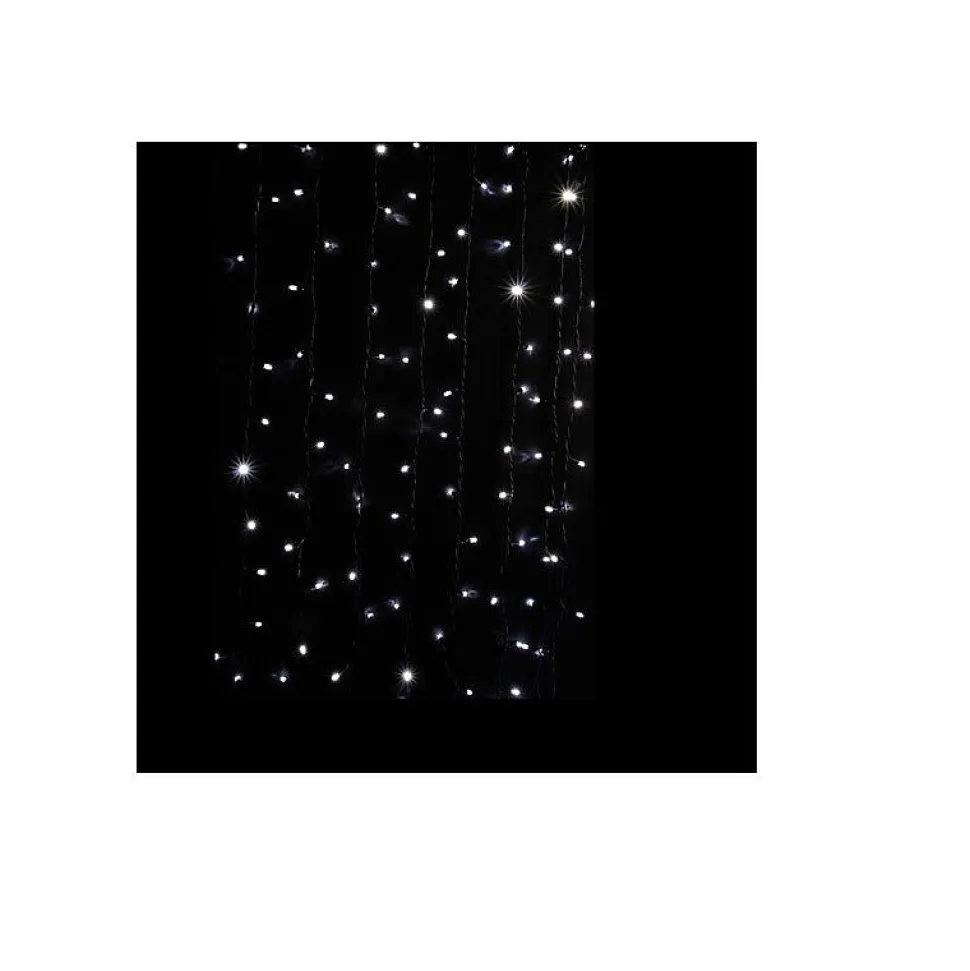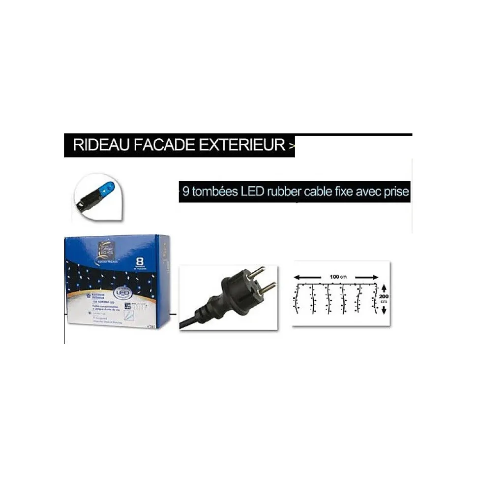 Guirlande lumineuse en rideau de façade. Guirlande pour l’extérieur et l’intérieur composée d’un fil de 100 cm de long à poser horizontalement sur lequel sont accrochées 9 tombées de lumière de 200 cm de hauteur + cordon d’alimentation de 1.5 cm de long. 171 ampoules Leds forte luminosité. Lumière fixe. Fil noir, ampoules bleues. Se branche sur le secteur grâce au transformateur fourni. En pvc, cuivre et verre. Poids 1 kg.