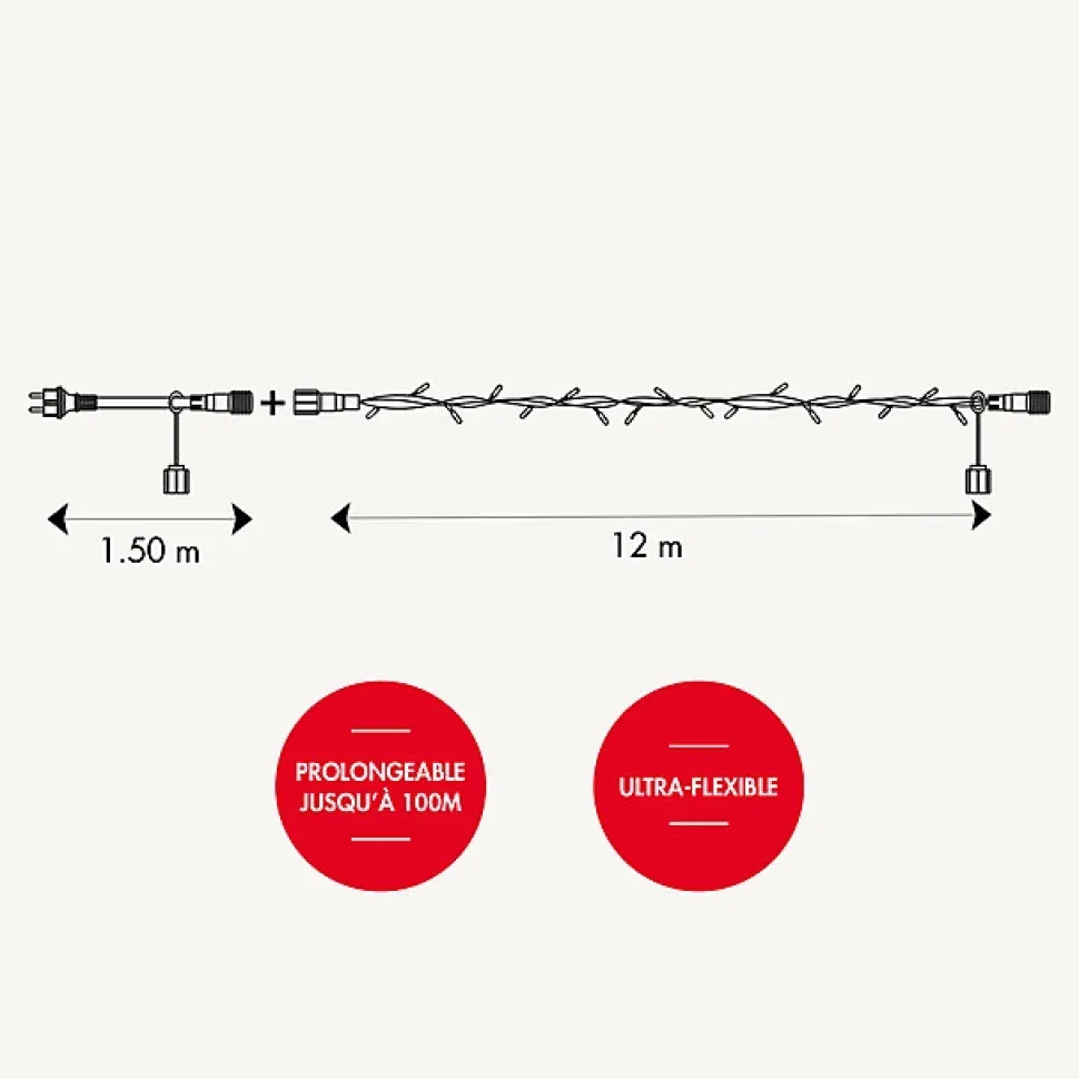 Notre guirlande est parfaite pour faire briller votre maison ou vos occasions spéciales. C’est un indispensable pour illuminer vos arbres et couvrir vos extérieurs de lumière. Sa qualité professionnelle lui permet un usage autant domestique que public. Elle peut s’utiliser aussi bien à l’extérieur qu’à l’intérieur. Raccordez jusqu’à 100m de lumière sur un câble d’alimentation.• Nb de LED : 120 LED• Couleur de LED : Blanc chaud• Couleur du câble : Blanc• Animation : Scintillante• Dimensions : L12m• Puissance : 7.5W• Tension : 230V• Lumens : 240 lumens• Alimentation : filaire, alimentation incluse.• Prolongeable : jusqu’à 96m – 8 produits maximum• Connecteur B• Matière : Caoutchouc• Usage : Intérieur/Extérieur IP44• Qualité professionnelle• Garantie : 2 ansUsage & installation :De qualité professionnelle, cette guirlande peut être utilisée aussi bien à l’intérieur qu’à l’extérieur. L’indice IP 44, vous garantit une utilisation extérieure quelle que soit la météo tout au long de l’année.Données techniques & dimensions :Cette guirlande de 12m est prolongeable jusqu’à 100m, vous pourrez éclairer une grande surface. Elle est vendue avec son câble d’alimentation redressé. Elle est compatible avec nos connecteurs B Plug & Light 230V.Source lumineuse :La guirlande est composée de 120 LED scintillantes réparties sur 12m de longueur. 1 LED/5 est animée de la même couleur que la guirlande.