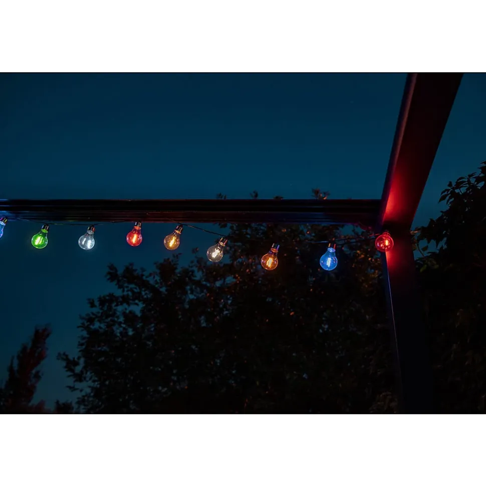 Guirlande guinguette à énergie solaire en plastique avec 10 LED multicolores à filament COB. Puissance panneau solaire 0,29 W. Durée maximum d’éclairage 8 heures. Interrupteur on/off manuel. Batterie rechargeable Ni-Mh AA 600mAh incluse. Design rétro guinguette. Résistant aux intempéries, sans câblage nécessaire, installation flexible.