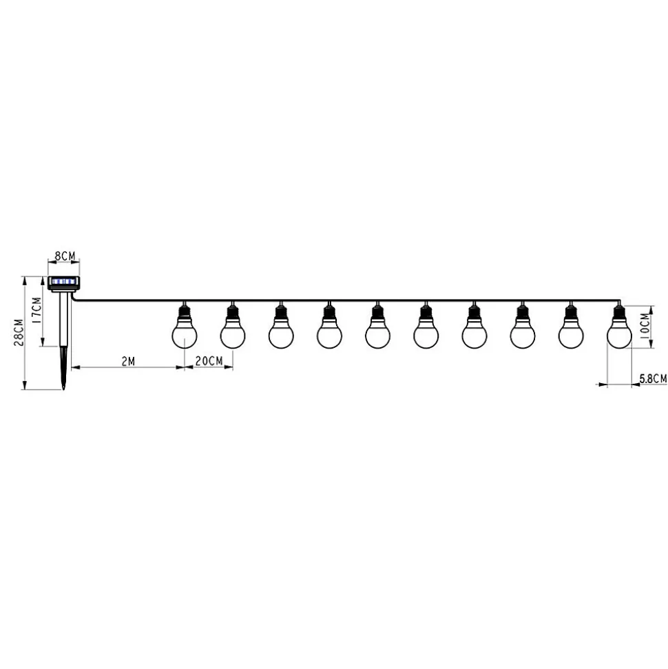 Guirlande guinguette à énergie solaireMatière : plastiqueNombre de Lumens : 10Durée maximum d’éclairage : 8 heuresInterrupteur on/offLED : 10 LED COB Filament multicoloresBatteries rechargeables : 1 x 600mAh Ni-Mh AADimensions produits : (voir le schéma technique parmi les images)Longueur : 3,80m2m entre le panneau solaire et la 1ère ampoule – 20cm entre chaque ampoule